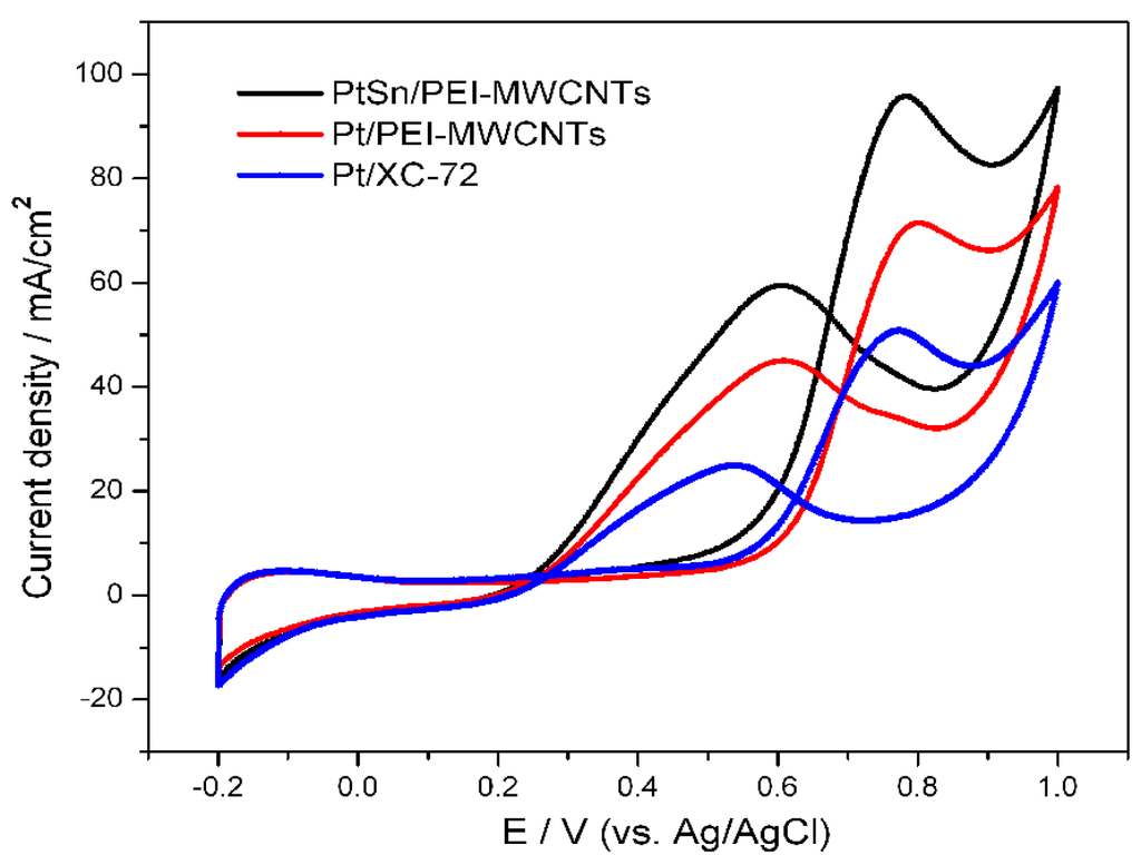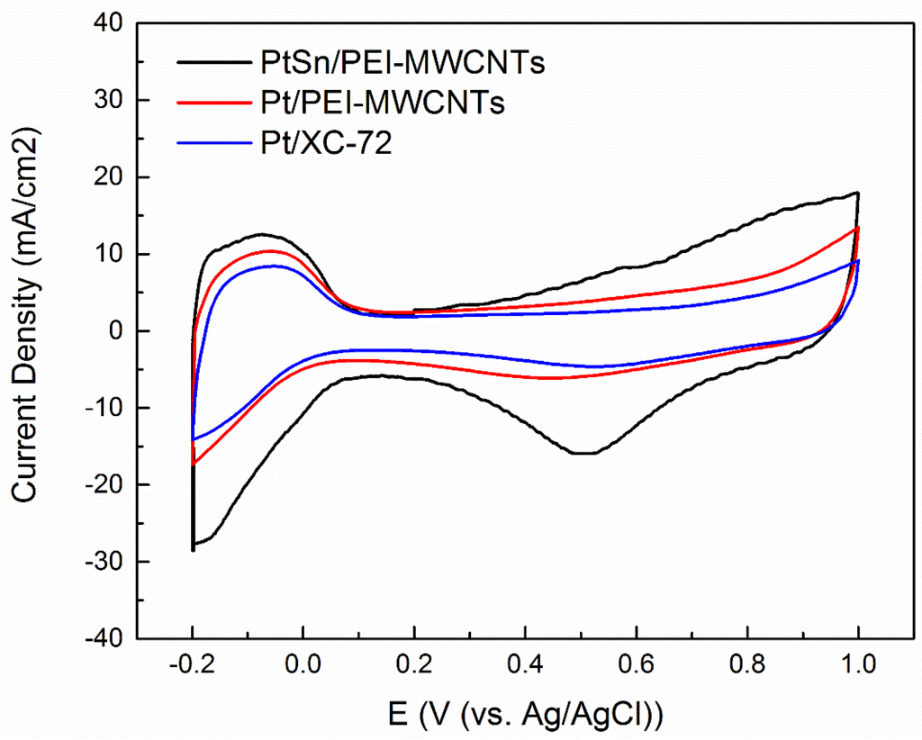 In summary, Pt and bimetallic PtSn NPs were homogeneously decorated on noncovalent functionalized MWCNTs via in-situ polyol reduction method. This polyelectrolyte modification strategy provided the desirable dispersion of metal NPs on CNTs, and can be extended for the assembly of a large variety of Pt-based hybrid materials. Electrochemical studies demonstrated that the as-synthesized PtSn/PEI-MWCNTs nanocomposites displayed improved catalytic activity towards ethanol electrooxidation with forward current density of 95.8 mA/cm2 and a better poisoning tolerance towards as predicted by the bifunctional mechanism. A future study on optimizing the ratio of Pt and Sn in PtSn/PEI-MWCNT catalyst system for further improved performance in DEFC application is desirable.