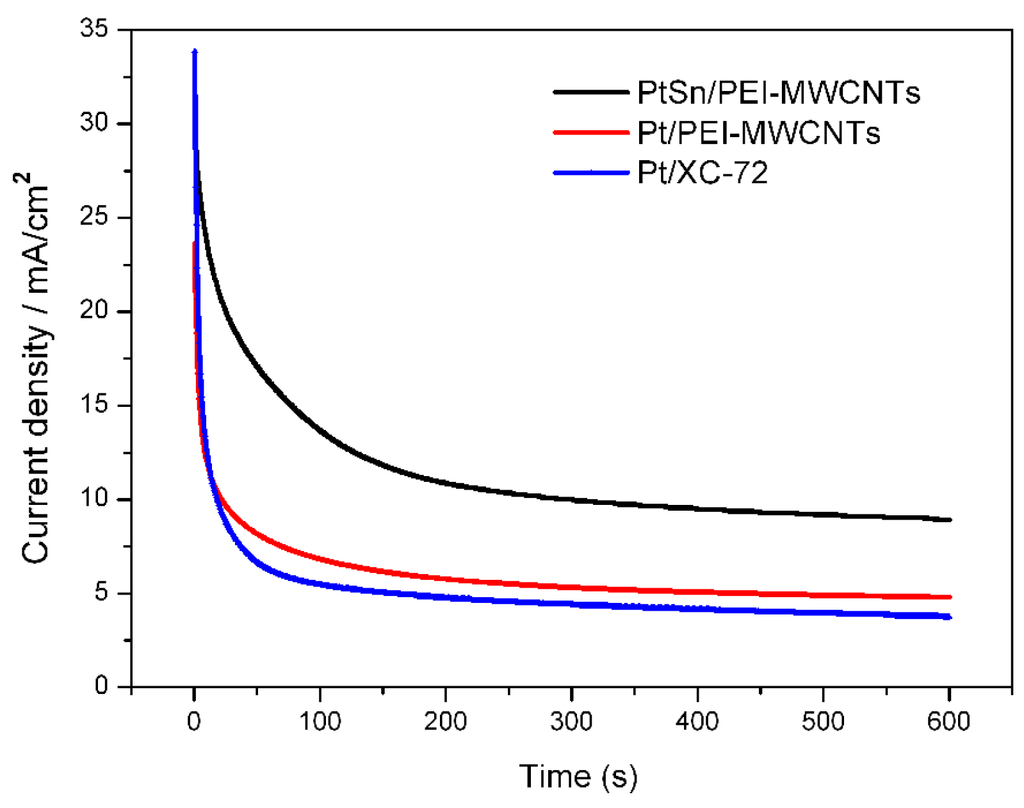 Figure 9 shows the current-time curves measured at a constant potential 0.6 V in 1 M C2H5OH + 0.5 M H2SO4. For all catalysts, the potential-static currents drop rapidly in the initial stage, and then reach a pseudo steady state after a period of approximately 300 s. The initial high current is associated with double-layer charging, while the current decay is caused by the accumulation of poisonous carbonaceous intermediates on the electrode surface [48]. As seen in the chronoamperometric profile, PtSn/PEI-MWCNTs maintain the higher current density and lower current decay rate when compared with Pt/XC-72 and Pt/PEI-MWCNTs. The less pronounced current decline on PtSn/PEI-MWCNTs is indicative of its better poisoning tolerance towards EOR. Based on the bifunctional mechanism, the second metal Sn activates water at lower potentials, which produces adsorbed oxygen-containing species to remove the adsorbed CO and therefore liberate Pt active site. In addition, the ligand effect may also occur to alter the electronic properties of Pt and in turn weaken the Pt–CO bond by introducing Sn element [49,50].