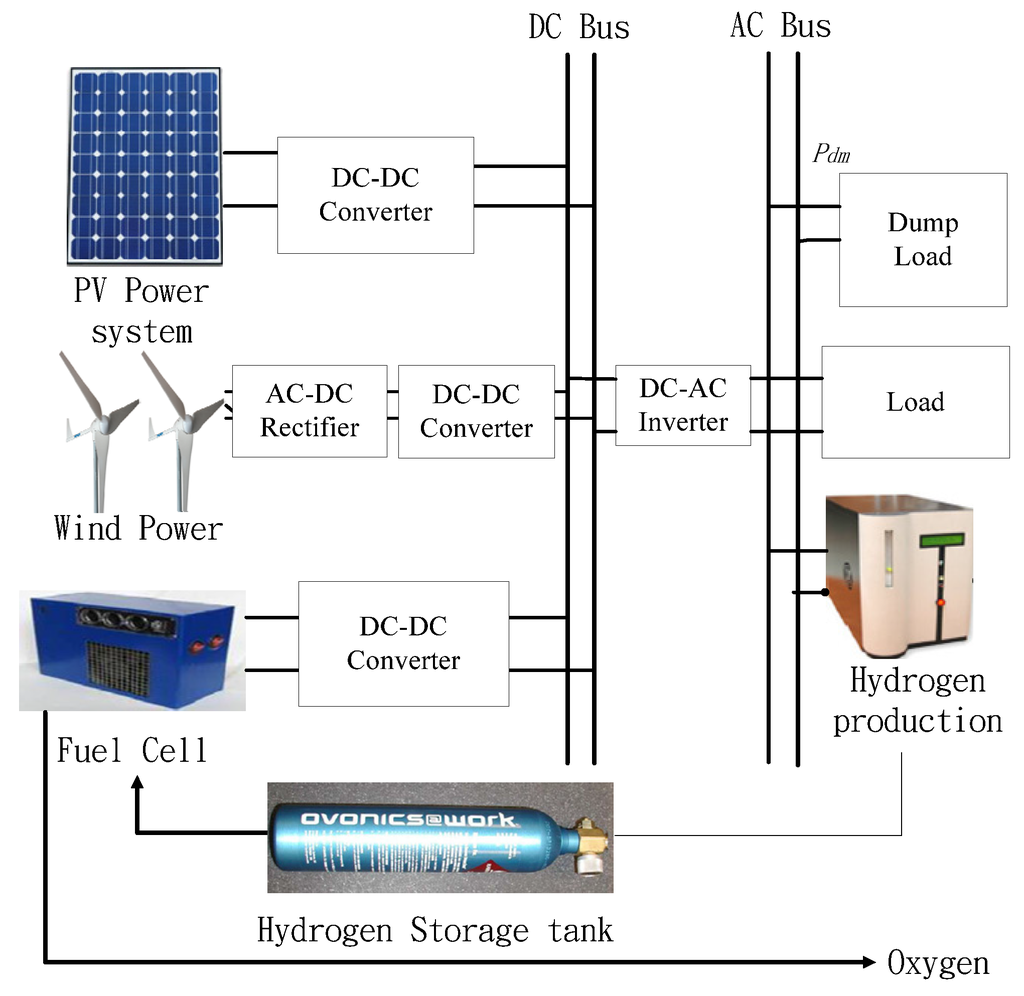 The stand-alone power system is divided into electricity generation, energy storage and standby energy. Electricity generation is formed by the wind power and PV power system using the kinetic energy of wind and the solar luminous energy. Although the wind and solar complementary systems make up for each other’s deficiencies as shown in Figure 1, where the natural energy generating capacity cannot create a continuous power supply all the time due to weather variations. Therefore, energy storage equipment is required. When the electricity generated is enough, it shall launch the electrolyzer to produce the hydrogen, and store the latter in the hydrogen tank. When the generating capacity is insufficient, it could use the hydrogen in the hydrogen tank and the fuel cell to satisfy the load as shown in Figure 2. The dump load is also included as a component in the system to consume the excess electricity when renewable power is abundant and the storage system is fully charged. In order to make a system device with the most cost-saving and most efficient power supply capacity, the system capability configuration must operate optimally.