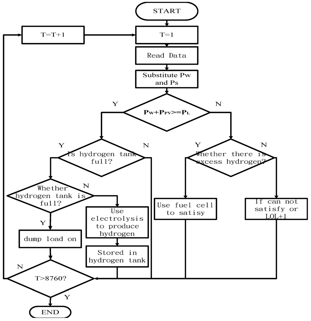 Normally, this system uses wind power and PV power system, and makes use of wind-light complementarity feature to generate electricity. If wind turbines and solar cell cannot supply rated load, then determine whether there is hydrogen can be used, and then use hydrogen to satisfy load. The loss of load hours βH will increase if hydrogen is not sufficient. The calculation process is shown in Figure 2, where PW is power capacity of wind power, PPV is power capacity of the PV power system, PL is load capacity.