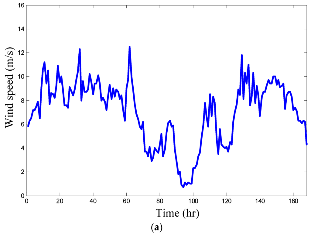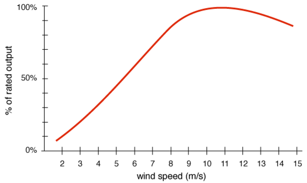 When the wind speed reaches Voff, the turbine will generally lock the rotor and suspend power generation in order to prevent the wind turbine from operating at speeds which may damage the blades, and this wind speed is called the shutdown wind speed. On the contrary, when the wind speed is lower than Von, although the wind turbine can continue generating electricity, usually its operation will be suspended to prevent the wind turbine from disconnecting from/connecting to the power system too frequently, and this wind speed is called the cut-in wind speed. Based on Equation (10), the typical curve of the wind power system is shown in Figure 3 [14]: