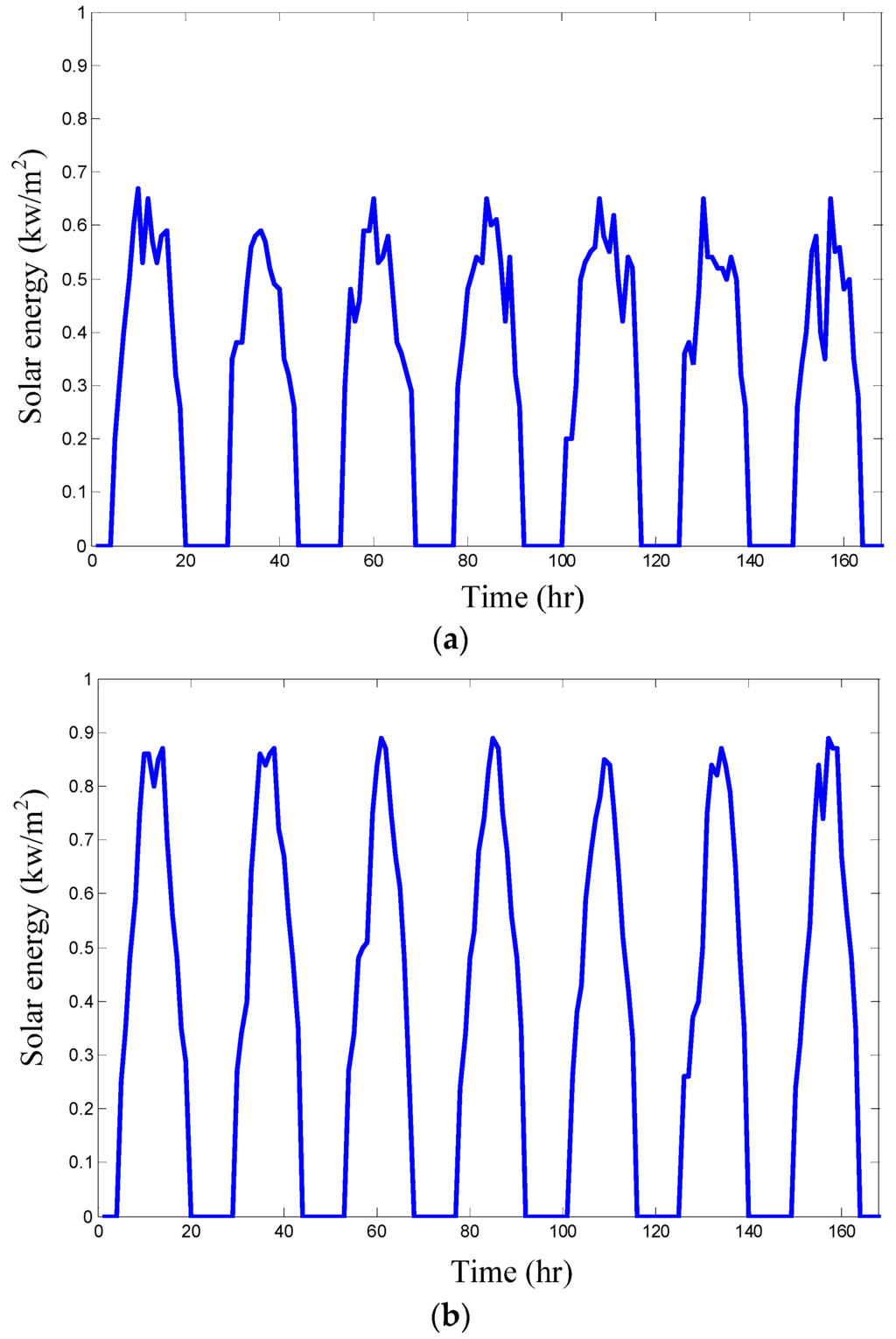 The curves of the typical solar illuminance (a) winter; (b) summer.