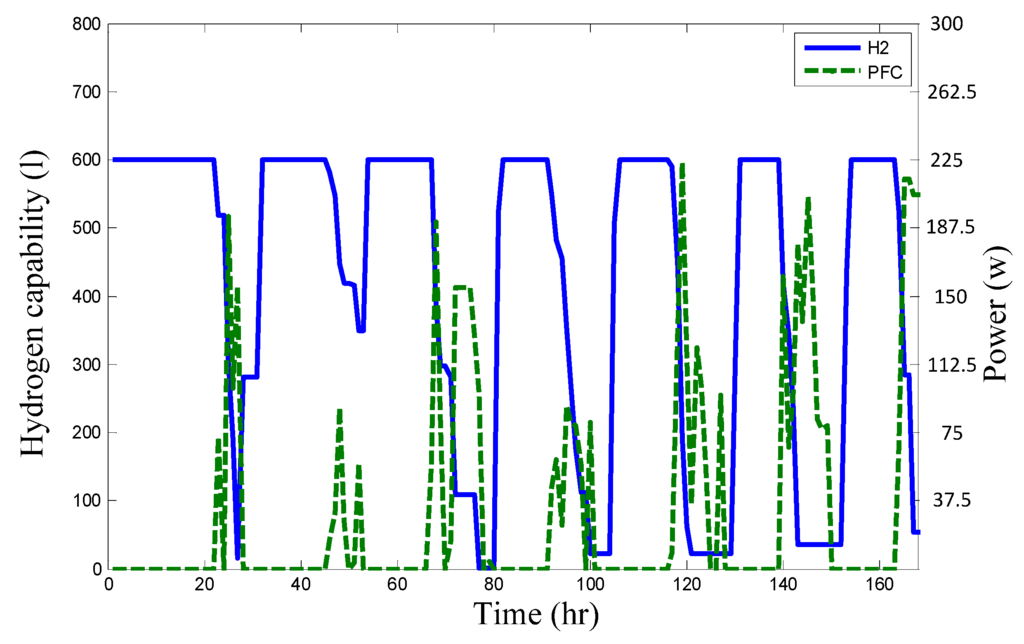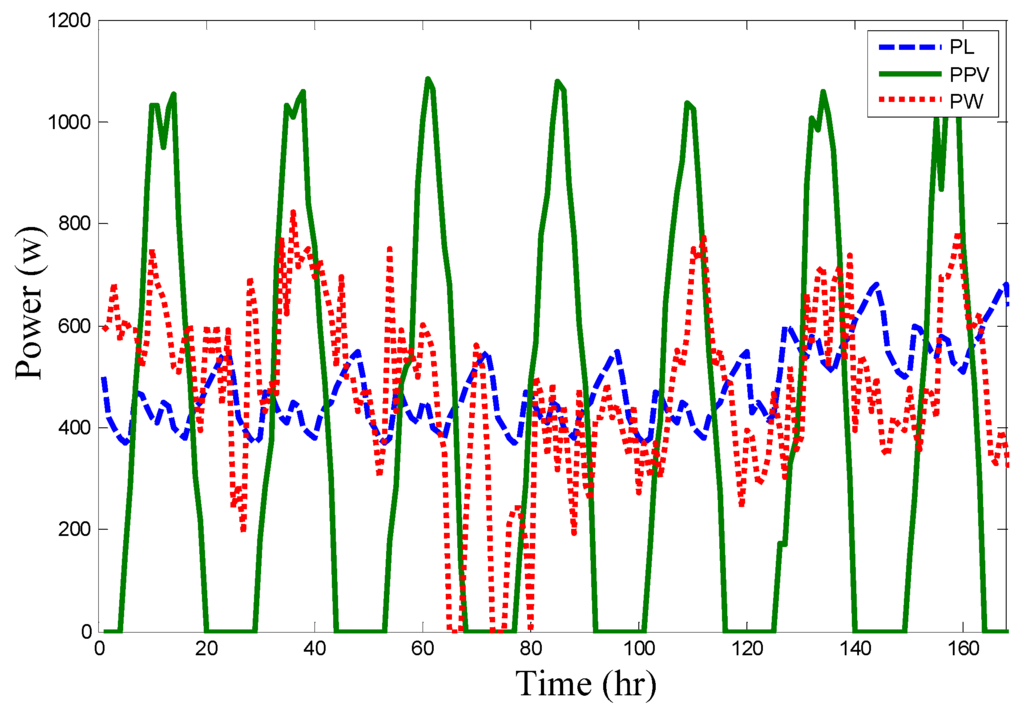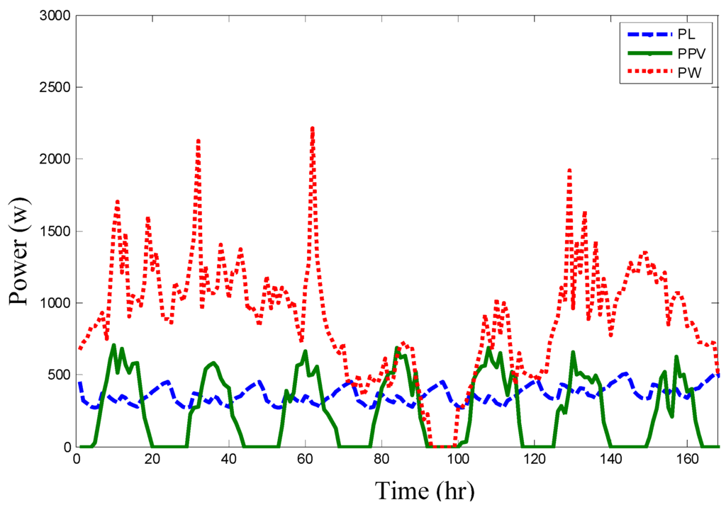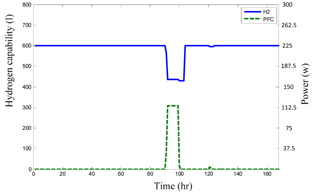 This study’s simulation adopts the weather data of the Wuci area in central Taiwan in 2014, provided by Taiwan Central Weather Bureau, to compare the wind speed and the illumination of the winter and summer, as shown in Figure 6 and Figure 7. The sun radiates directly on the Southern Hemisphere, and the illumination is small and the wind power is strong in Taiwan. The load power (PL), wind (pw) power and PV power (PPV) of the calculated optimum allocation are shown in Figure 8. If the amount is less than the generating capacity load, fuel cells will supply the load power, as shown in Figure 9. In summer, the load power (PL), wind (pw) power and PV power (PPV) of the calculated optimum allocation are also shown in Figure 10. If the amount is less than the generating capacity load, fuel cells power will be used to supply the load, as shown in Figure 11. In summer, the sun directly radiates on the Northern Hemisphere, the PV power increases in energy. However, there are usually windless situations in the summer, and the operation of the wind power generator is suspended during typhoon season, thus wind power generation shall decrease. Generally, during the daytime, solar energy is abundant and the use of the fuel cells is not required, and the system is able to produce hydrogen for extra needs. At night, there is no illumination, and only wind power generation provides energy. The fuel cells shall use the hydrogen to support the load. At night, in addition the home electricity usage increases, therefore, in the stand-alone power system, the fuel cell does not need much generating capacity, but needs more hydrogen tanks for standby to supplement the load demand.
