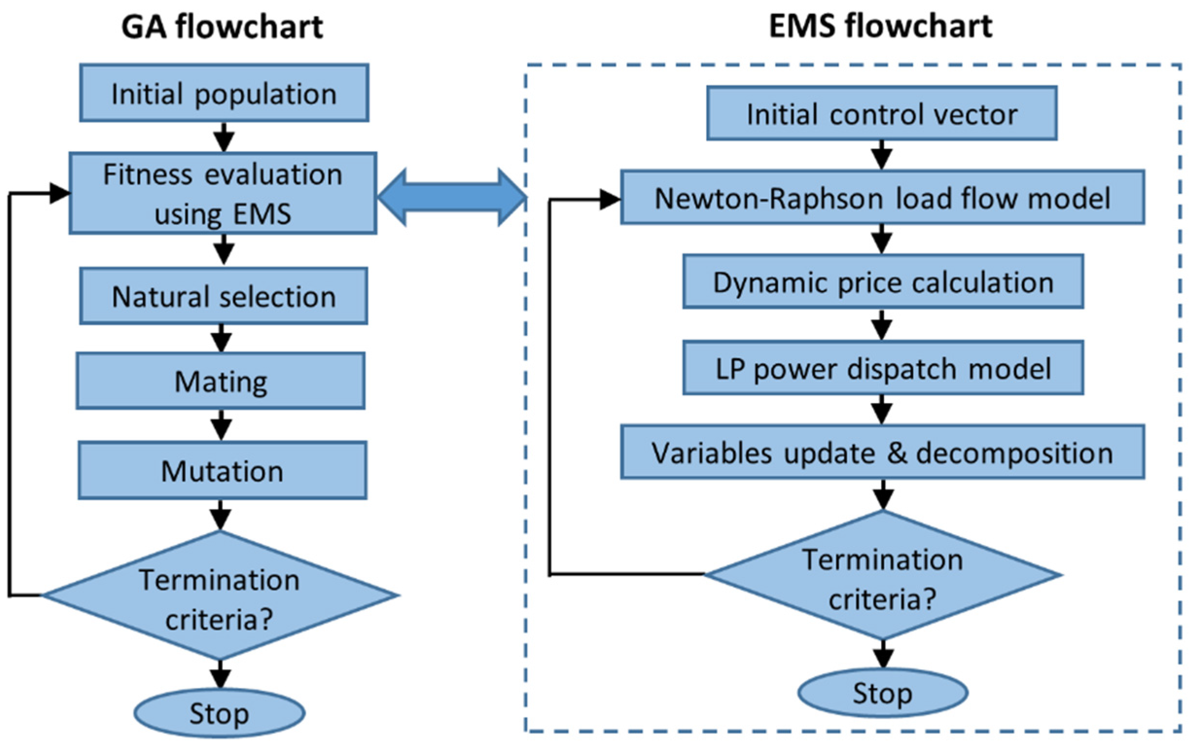 The proposed optimization framework, shown in Figure 2, employs a GA that is dedicated to optimizing the physical structure of the system, i.e., the size of DRG and DESS. In such an algorithm, different potential solutions (DRG and DESS combinations) are evaluated using an EMS and ranked based on their fitness. Therefore, an efficient EMS is required to simulate the daily power dispatching strategies of such solutions over a period of one year to predict the associated annual profits.