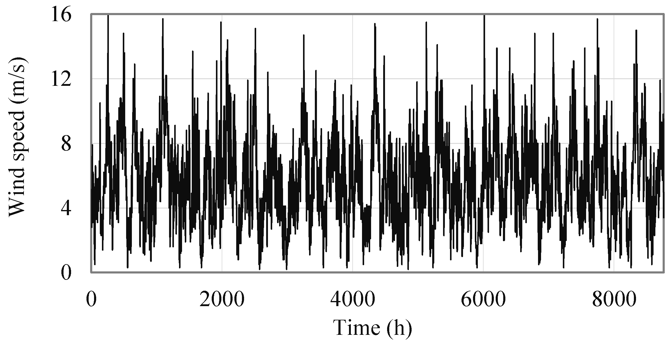 The IEEE 34-node distribution feeder was chosen as the MG for the numerical analysis in this study. A time-varying electric load in Okinawa, Japan, with an average daily energy consumption of 31 MWh and a peak power of 1750 kWh is assumed. A one year profile of the hourly wind speed data is shown in Figure 3. The energy price is shown in Figure 4 as a function of the purchased power, where the minimum and maximum rates are 0.1 $/kWh and 0.3 $/kWh, respectively, which is similar to the current rates applied by Tokyo electric power company [42].