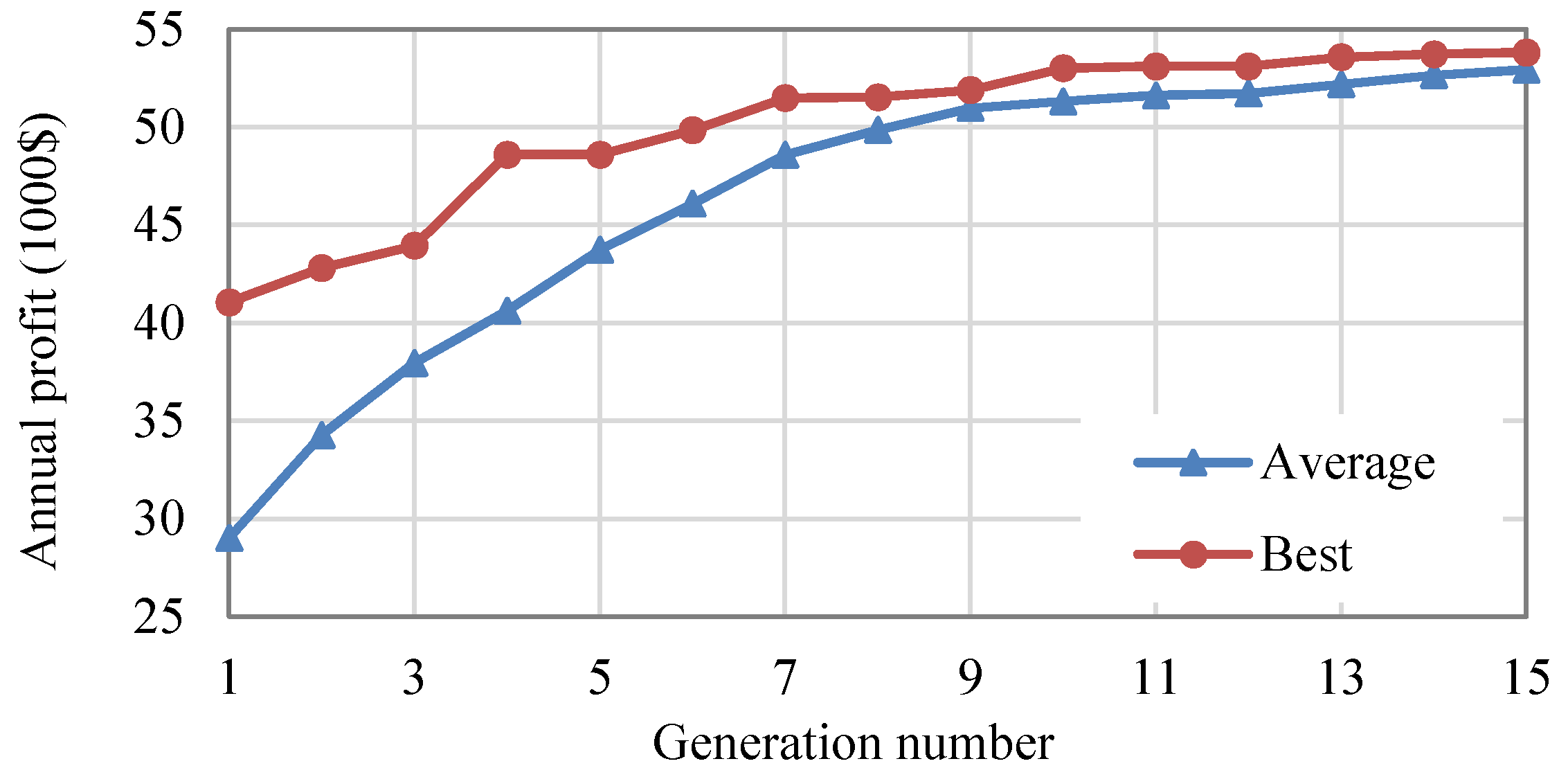 Figure 8 shows how GA evolves over generations in the case of IO optimization without DR, where a population of 60 was able to converge in 15 generations, taking roughly 15 h. The algorithm was implemented in MATLAB utilizing the parallel computing toolbox, which enabled using the full capacity of the CPU and yielded high computing efficiency; it took roughly 1 min to produce one year of scheduling for a given DRG and DESS combination. IBM ILOG CPLEX optimization software was used for performing the LP dispatch for a five-day time window every time, enabling better long-term planning.