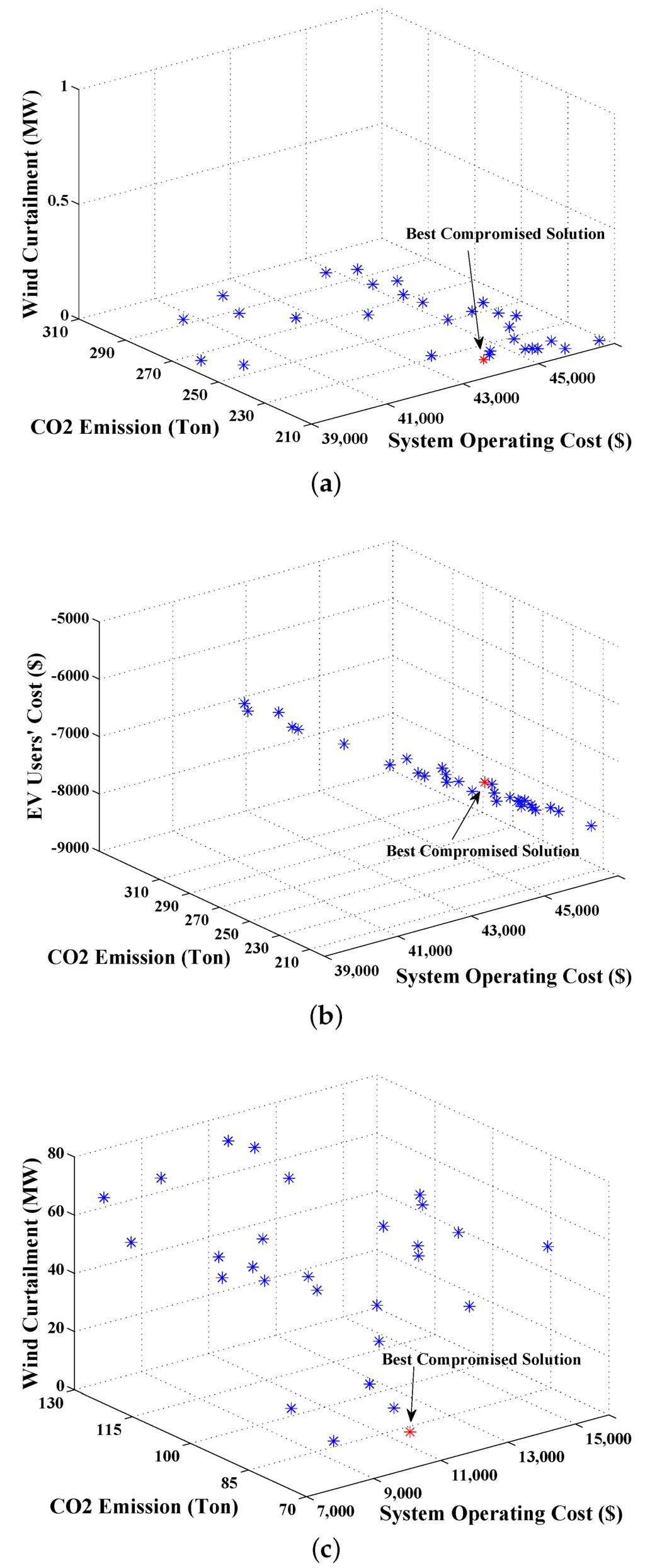 In today’s power system, while wind turbines, thermal plants, and EVs are all integrated into the grid, ramp rates, reserve capacity, fossil costs, carbon emissions, environmental costs, carbon capture costs, and power balance should all be considered when developing an optimal coordination strategy [13]. From the viewpoint of transmission grid, it is a quite complicated problem. Consequently, from the viewpoint of multi-objective optimization, the complicated optimal coordination problem can be formulated as a multi-objective problem (MOP) [18], which is solved by using a proposed multi-objective particle swarm optimization algorithm (MOPSO) [19,20]. Furthermore, to extract the best compromise solution from the Pareto optimal solution set, the fuzzy optimality decision making (FODM) method [21,22,23,24] is proposed in this paper.