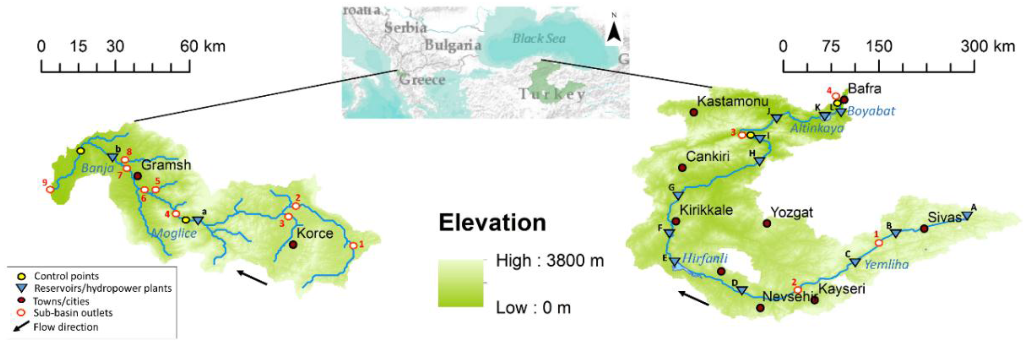 Case-study Devoll River Basin in Albania (left) and Kizilirmak River Basin, Turkey (right). The blue triangles are reservoirs; red rings with white fill indicate the outlet of a sub-basin in the model setups; the yellow circles are control points; dark red dots are towns/cities; and the black arrows indicate flow directions. Details on the reservoirs are provided in Table 1, further basin characteristics in Table 2.