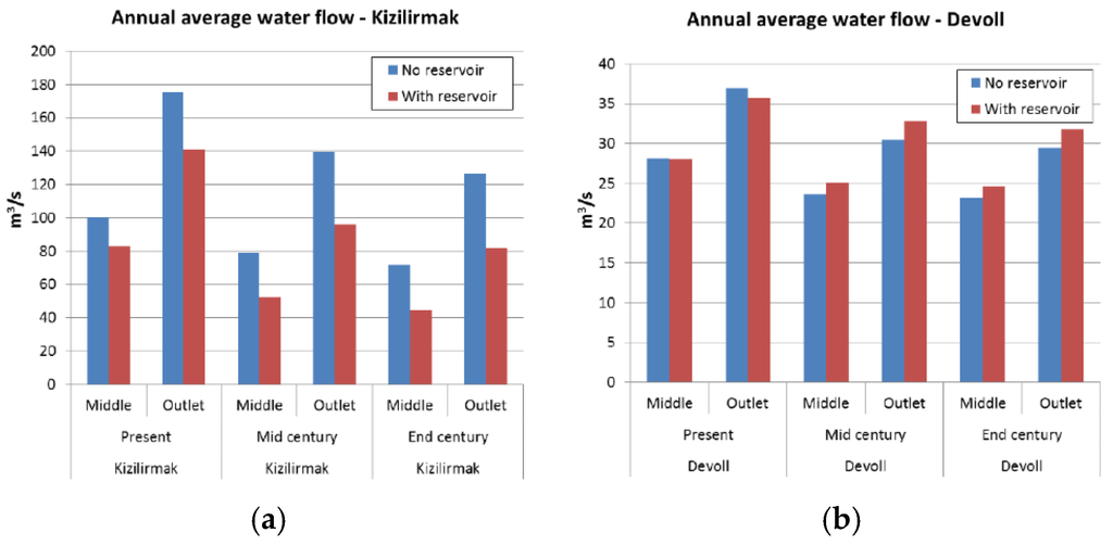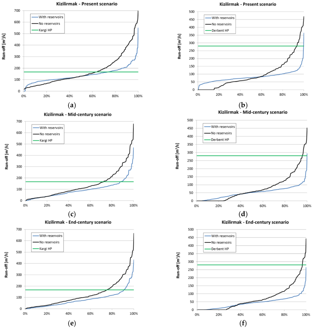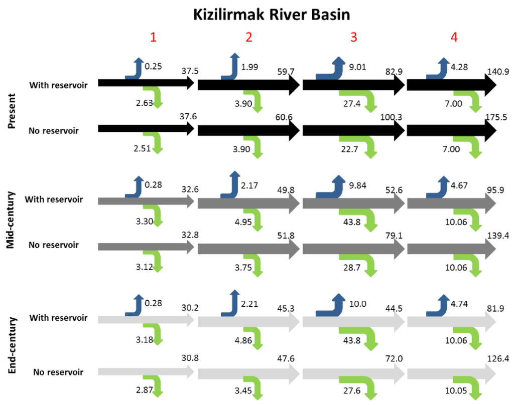 As the reservoirs at Devoll are currently under construction, the model was calibrated on historical data without reservoirs in the river basin. The introduction of reservoirs in the model setup under present conditions is hence a scenario analyzing the possible effects on water availability if the reservoirs had been in place already today (by 2015). In the simulations of the mid- and end of century situations, the reservoirs are assumed in operation. In order to analyze the effect on the water availability, these reservoirs are also removed from the future simulation. In the case of Kizilirmak, all of the reservoirs are assumed to be built and no new ones to be added. The future scenarios are simulated with and without the existing reservoirs.