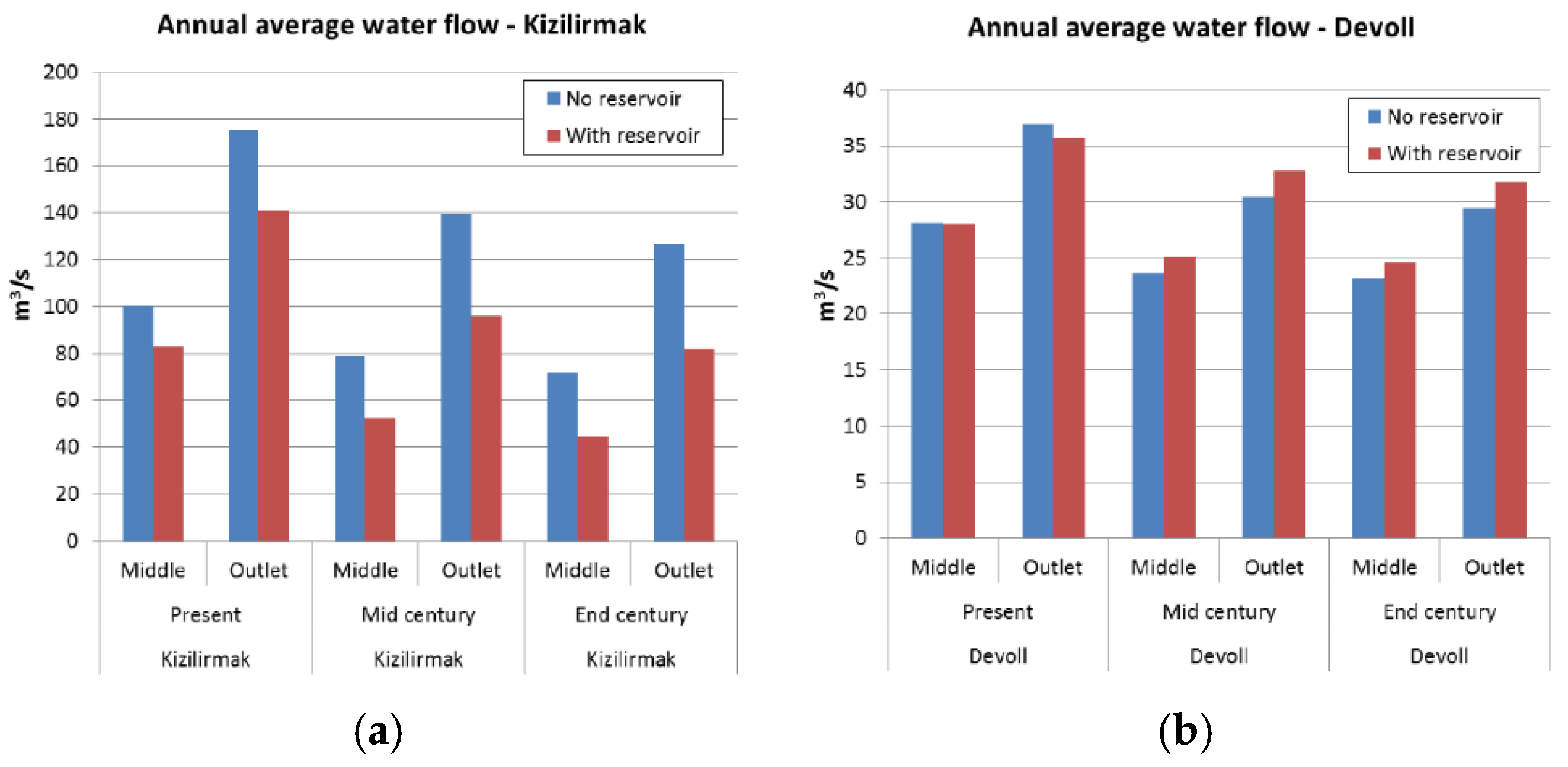 Average annual water flow at the middle lower and outlet control points, for the present, mid- and end of century situation, with and without reservoirs. The results from Kizilirmak are presented to the (a) and Devoll to the (b).