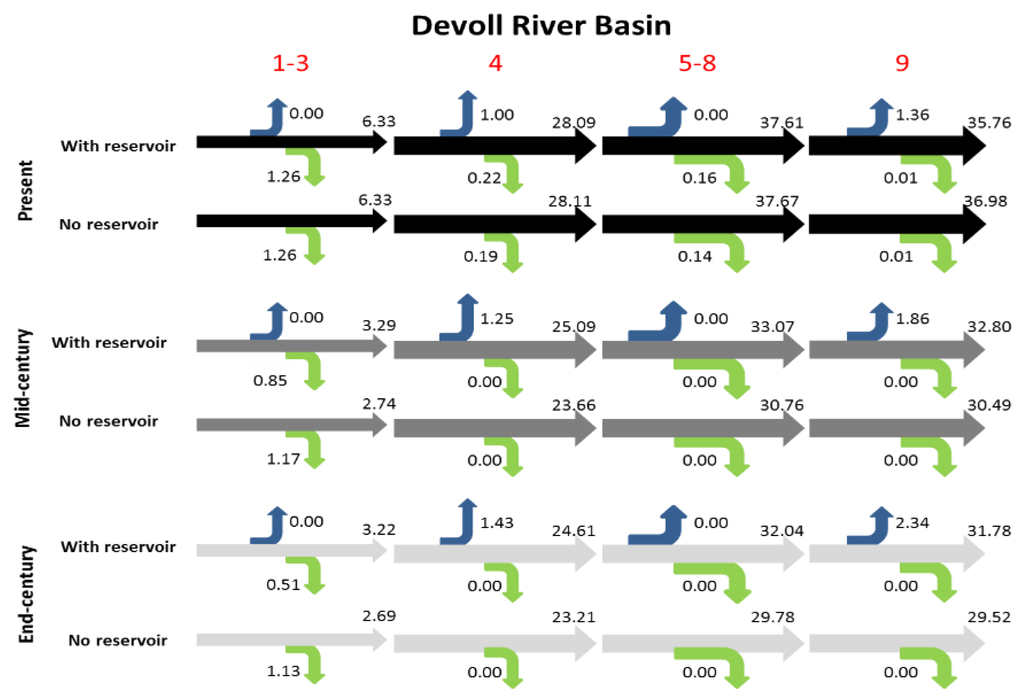 All three time horizon scenarios were run for both the situation with reservoirs and with all reservoirs removed from the model setup, in order to analyze the effects of the reservoirs on water availability. No new reservoirs are introduced into the model setup of the present situation. The mid- and end of century scenarios at Kizilirmak are model simulations for the periods of 2050–2055 and 2085–2090, while the mid- and end of century scenarios at Devoll are 2065–2070 and 2100–2105, respectively. The length of the simulation period (6 years) was determined by the combined requirements of available climatic data and reliable information about the state and operation of the reservoirs and the irrigation system.