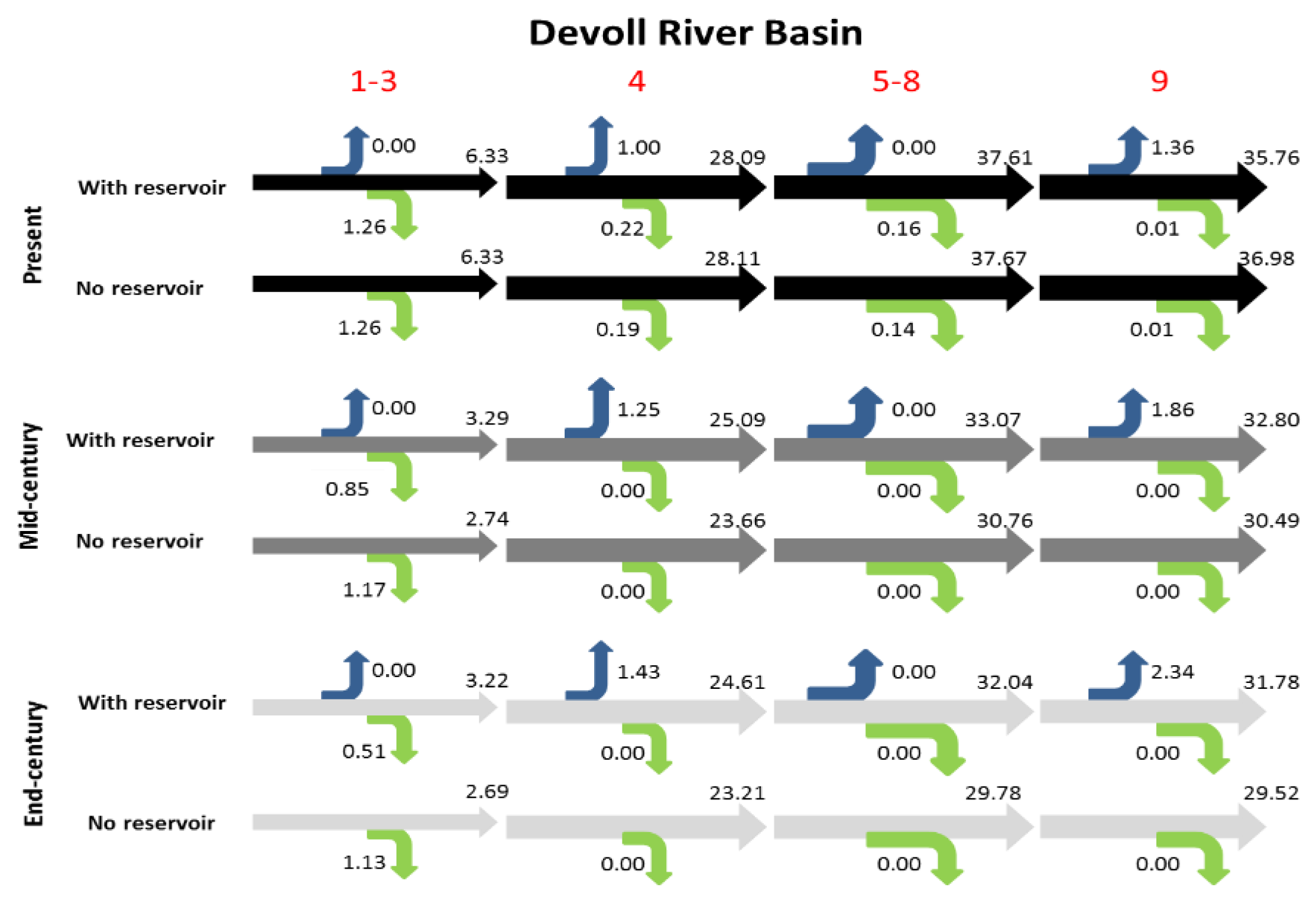 Spatial distribution of water losses/withdrawals at Kizilirmak River Basin during present, mid-century and end of century situations, with and without reservoirs. The horizontal arrows indicate water flows in the river; arrows pointing upwards sum evaporative losses from reservoir surfaces, and arrows pointing downwards water withdrawals for irrigation. The results are presented per sub-basin (red numbers on top), and the numbers are given as average annual water flows (m3/s).