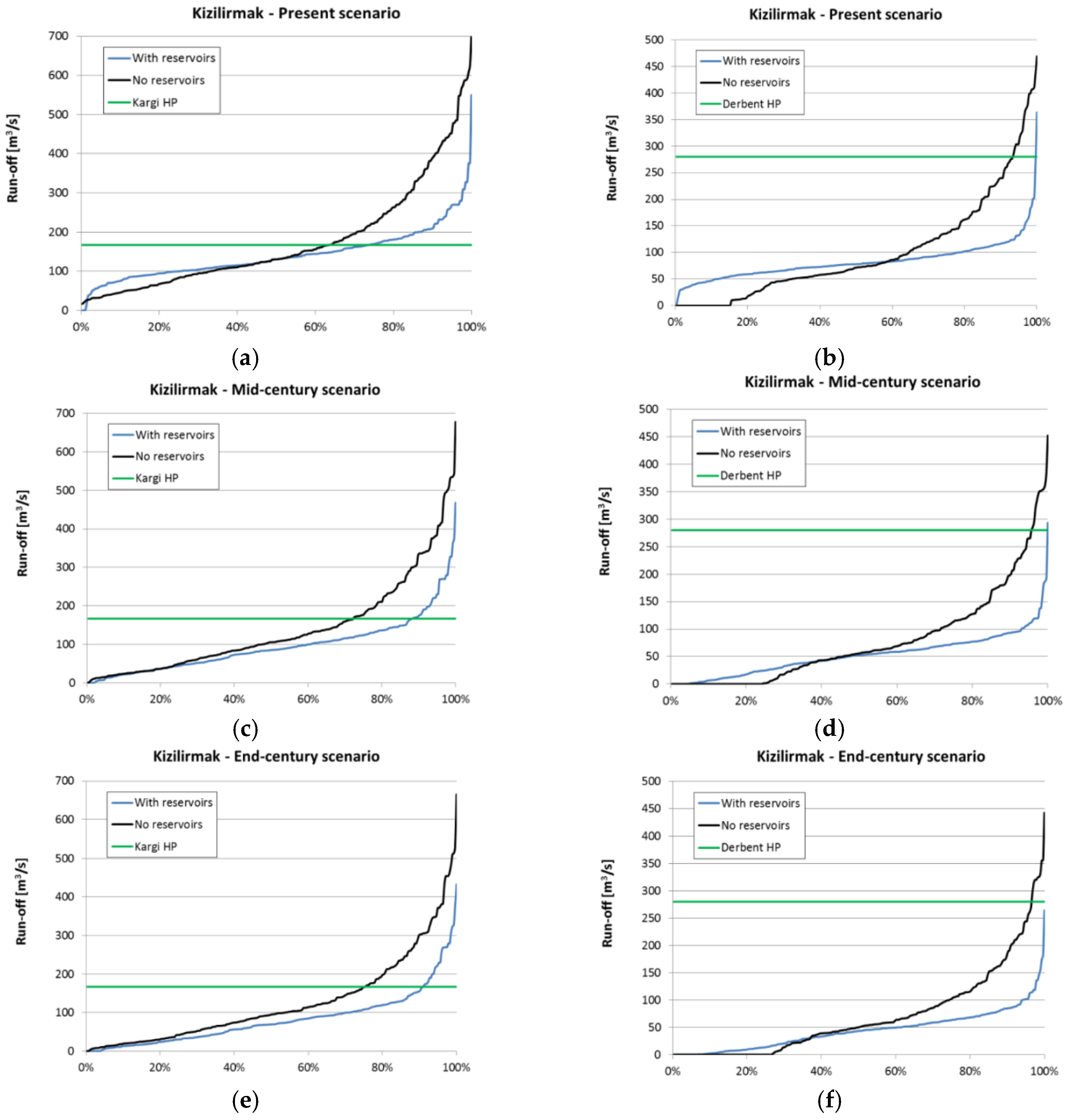 Scenario results presented as flow duration curves (exceedance curves) from Kizilirmak River Basin, under present, mid-century and end of century climatic conditions and irrigation withdrawals as specified in Table 4 and Table 5, with and without reservoirs present. The horizontal lines represent turbine capacities of the hydropower plants located close to the control points. (a,b) refer to present situation at the middle, lower control point and close to the outlet, respectively. (c,d) present results from the mid-century situation at the same control locations, while (e,f) refer to the end-century situation at the middle, lower control point and close to the outlet, respectively.