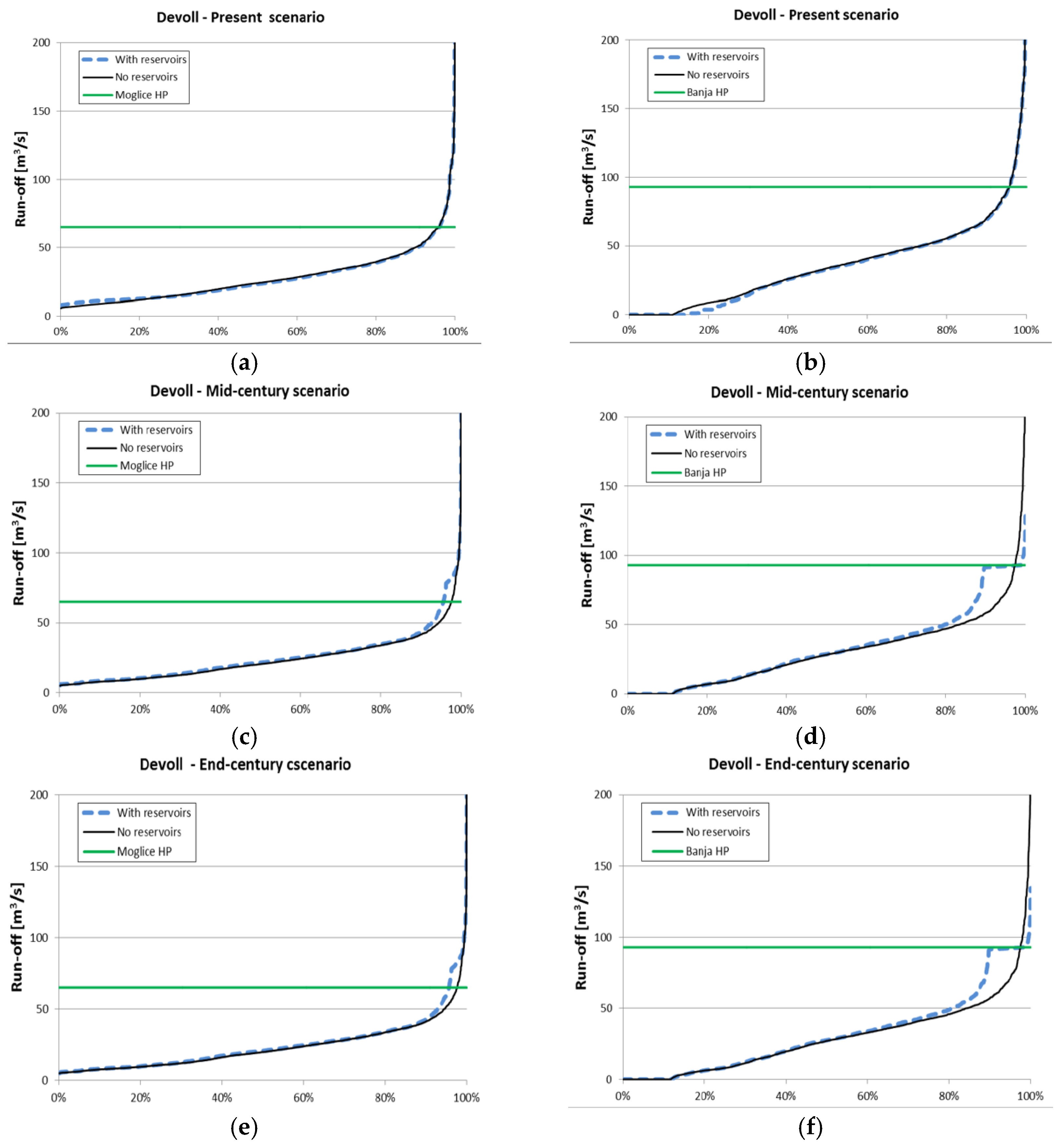 The flow duration curves at Devoll (Figure 6) do not differ very much in the situation with or without reservoirs, except the cap on the Banja curves (Figure 6, right part), which indicates the level where power production is on maximum turbine capacity (90 m3/s). The specified energy demand is met at this level, and surplus beyond this flow level starts filling the reservoir.