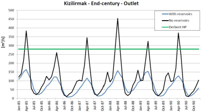Looking into the periodicity of the changes in water availability at Kizilirmak (Figure 7), we can see that it is lowest during the summer, both with and without reservoirs, and the introduction of the reservoirs removes the high flows. The regulation does not increase low flow during the summer at the end of the century. The reservoirs introduce a slight time shift of the low flow occurrences from mid-summer to late summer.