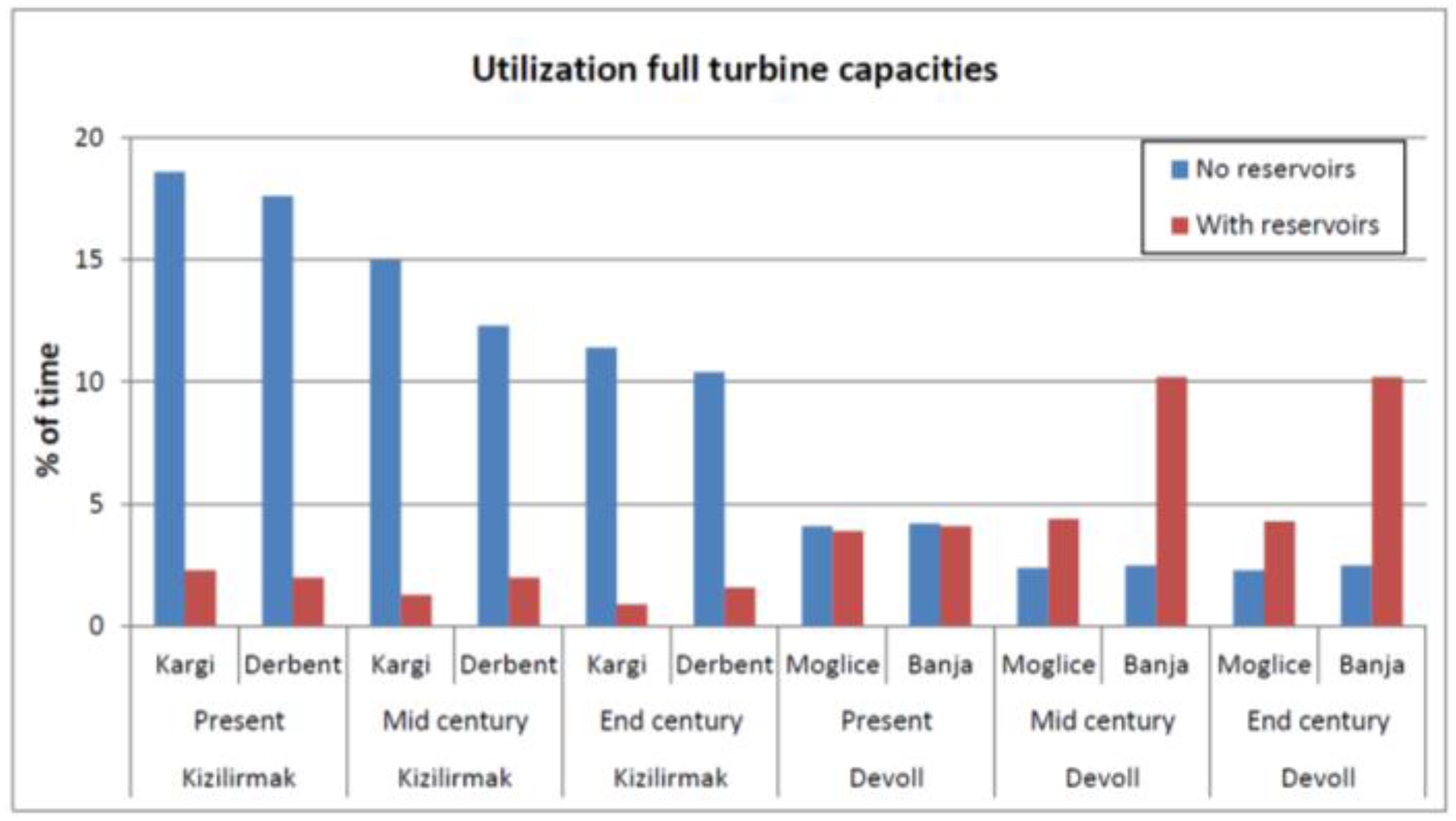 Percentage of time the full turbine capacities are utilized during the present and future situations, with and without reservoirs represented in the model setups.