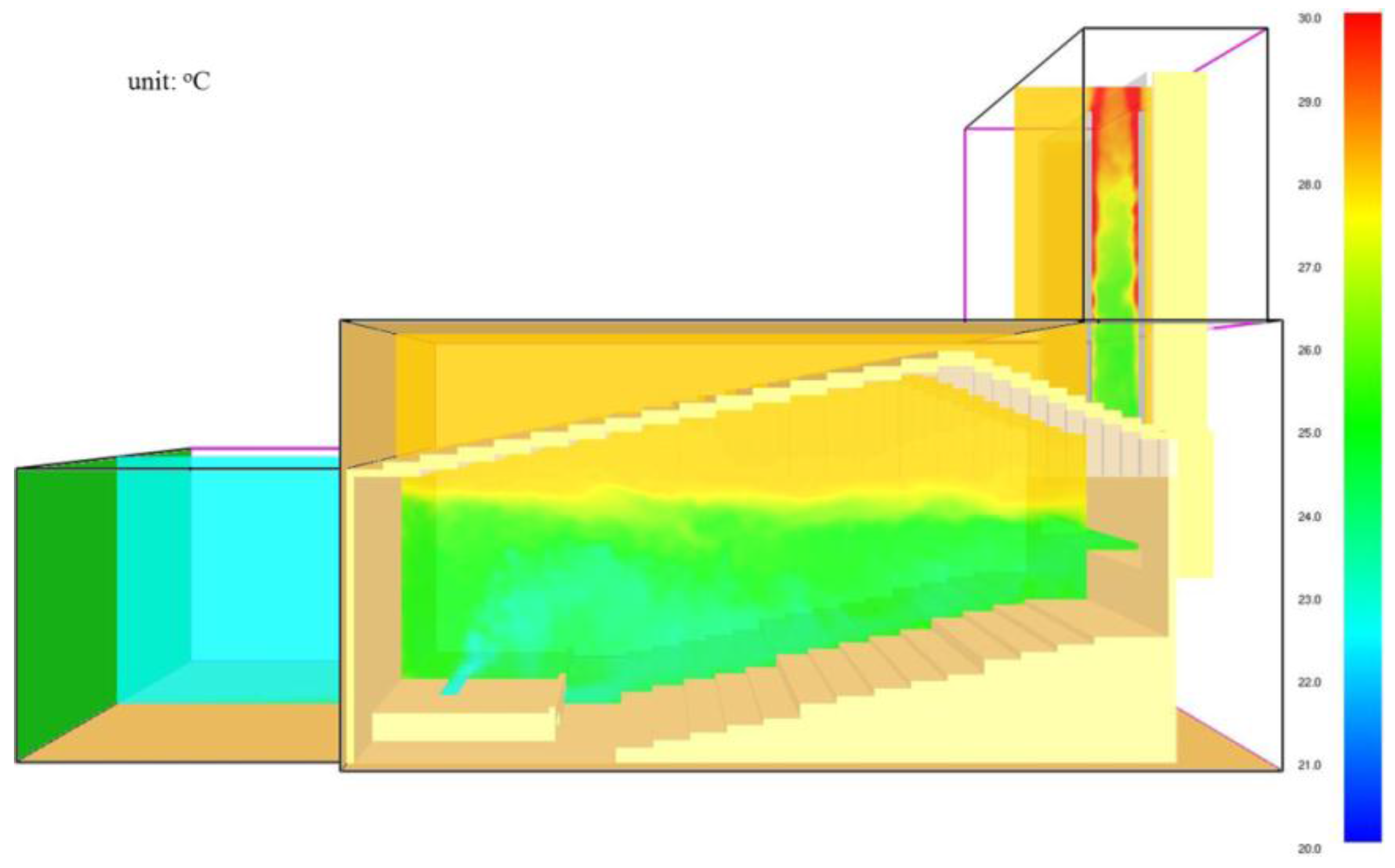 - Considering the indoor steady state, the state of the indoor center section was captured after 240 s of simulation to analyze the indoor condition. Figure 10 displays the temperature distribution. It was observed that the temperature stratification of the space was excellent. The upper part had a higher temperature of above 27.5 °C, while the lower seats, which were influenced by natural wind, had a temperature of 23 to 26 °C.