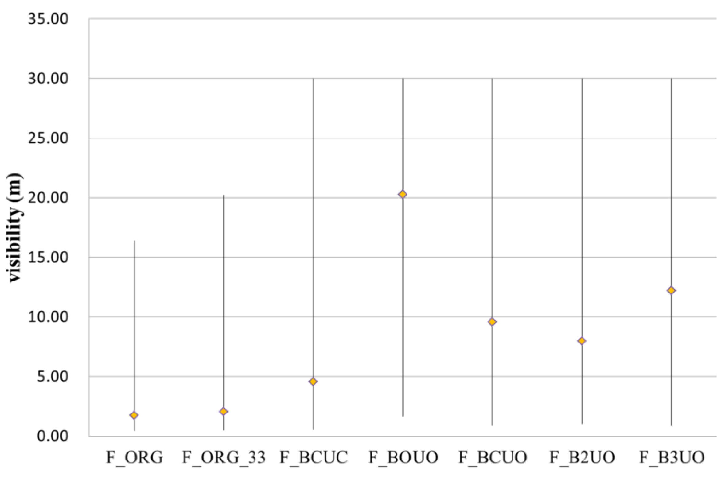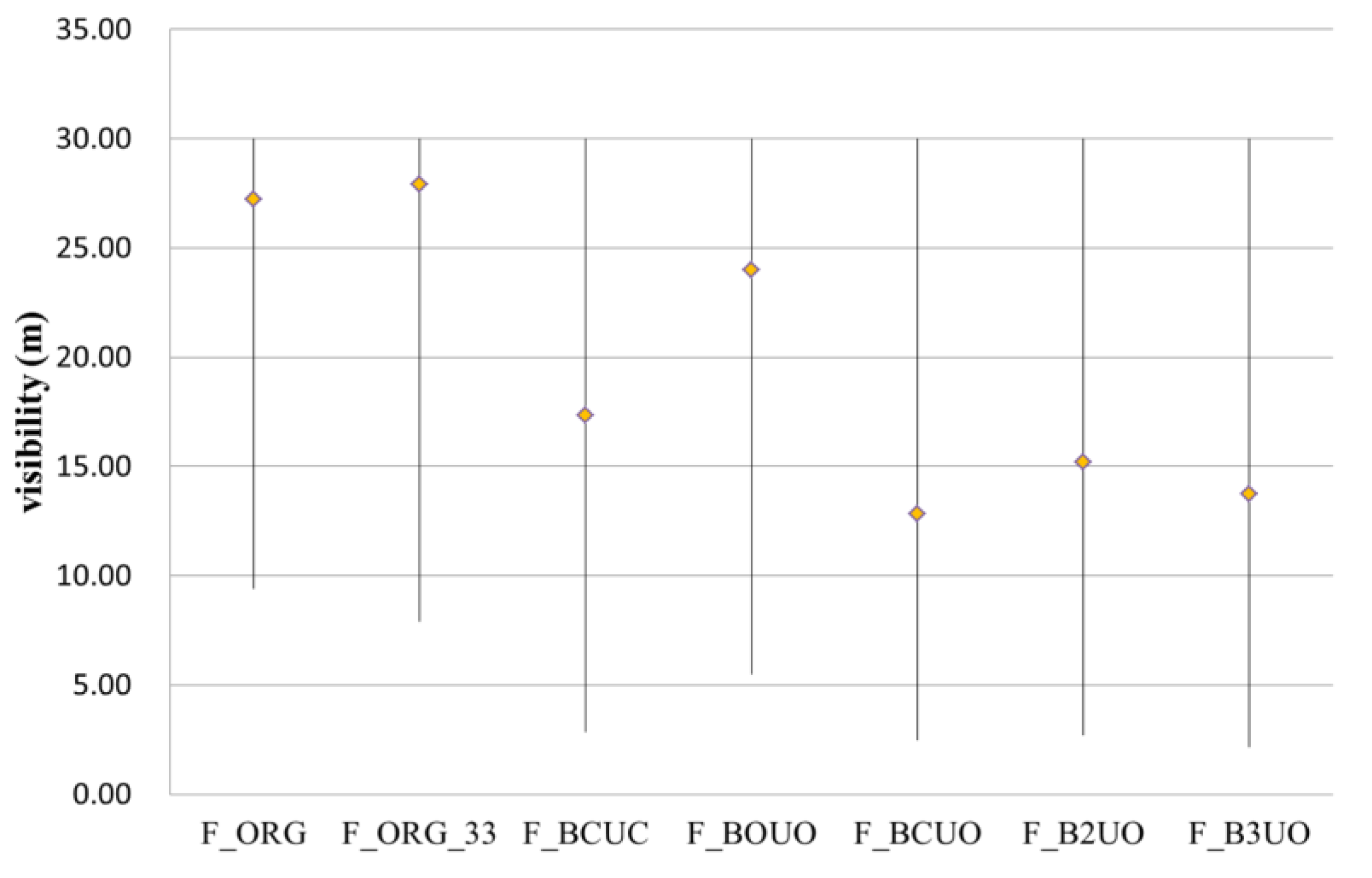 | Temperature (°C) | Visibility (m) | Temperature (°C) | Visibility (m) | ||