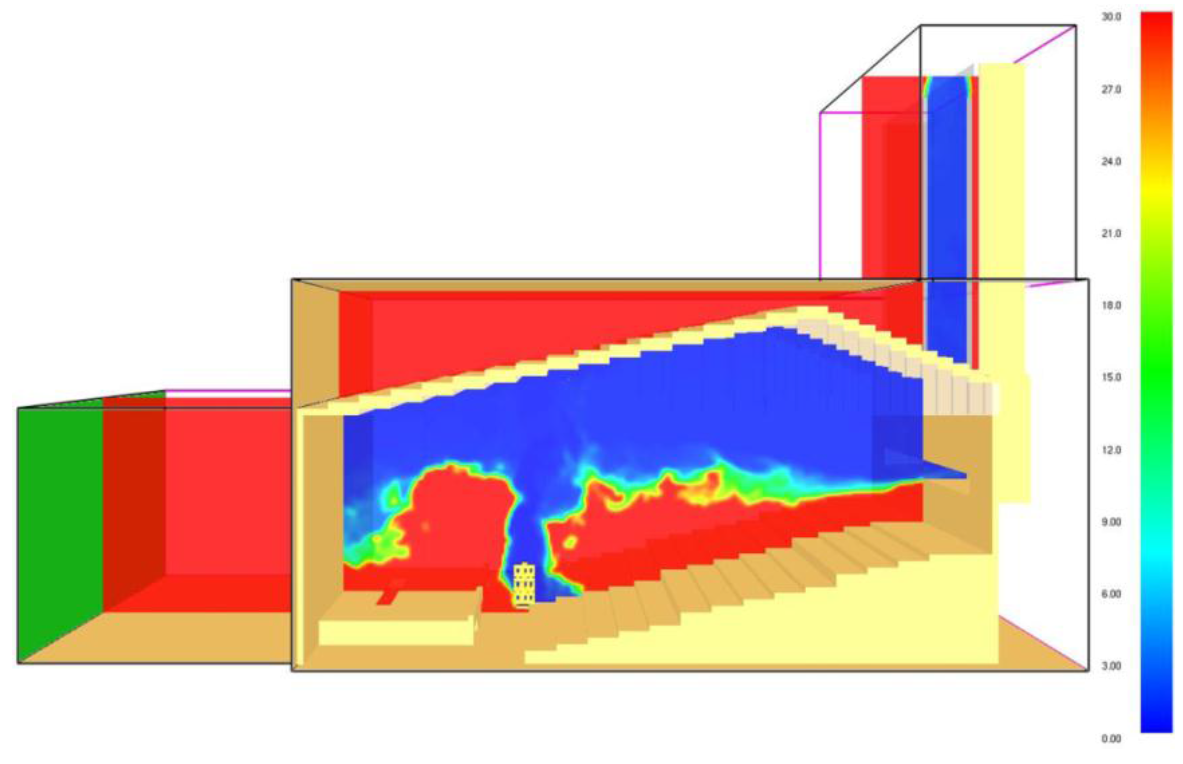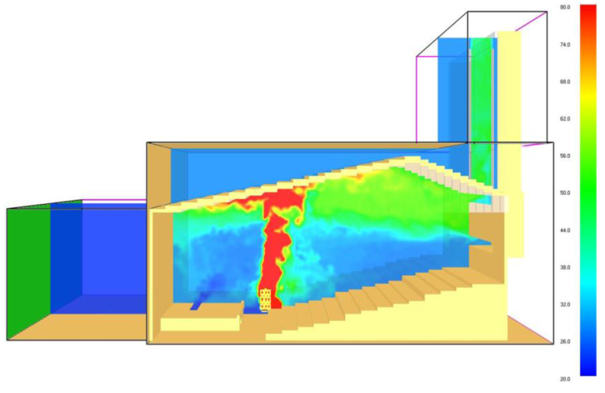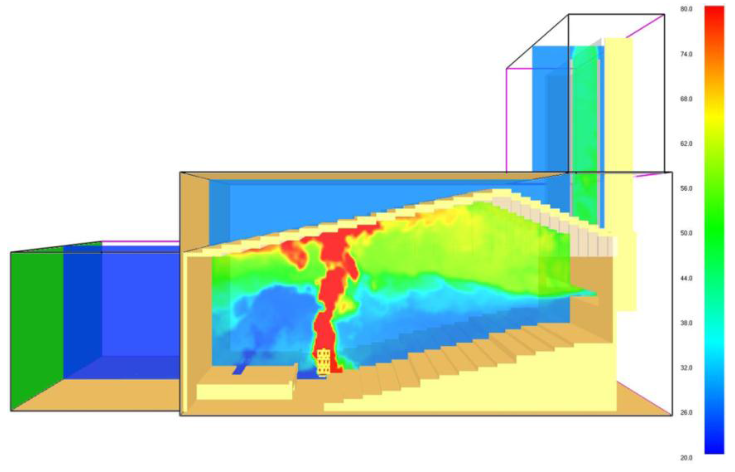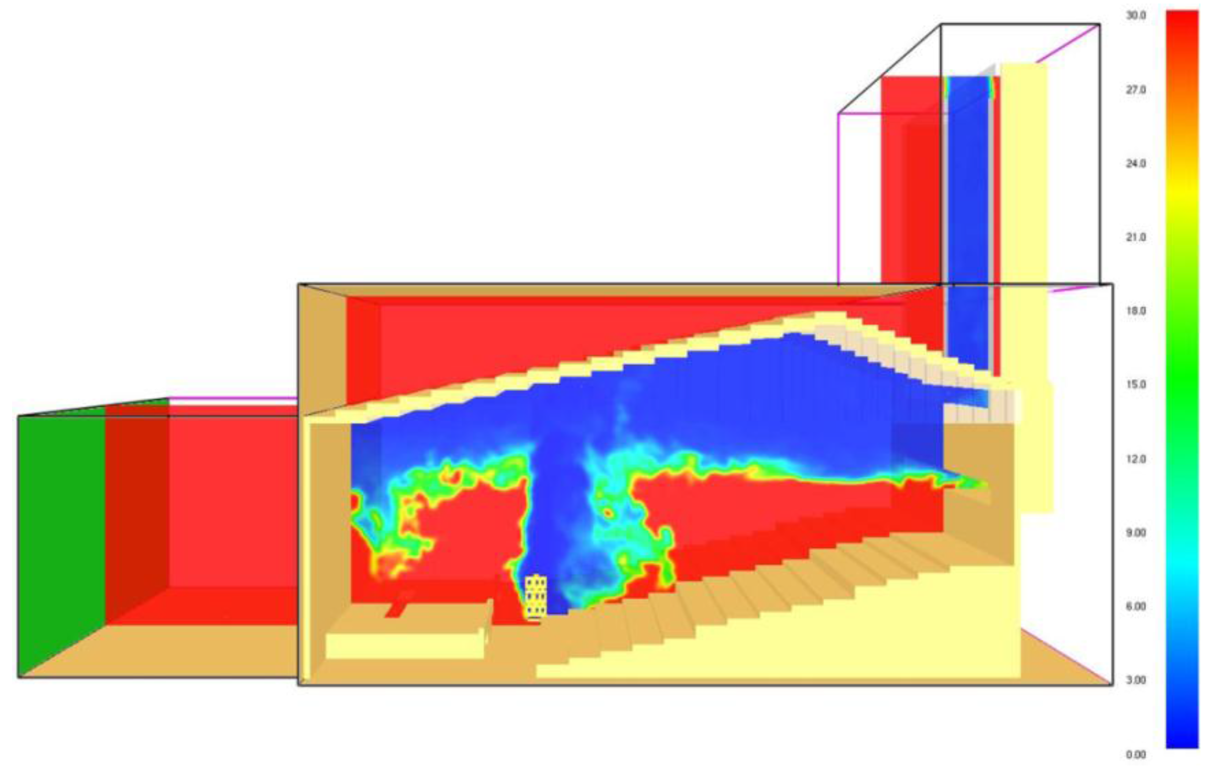 - In the third mode, the air inlet under the platform is closed, so the smoke emission effect of the upper smoke exhaust port and lower air outlet in the back wall can be analyzed.