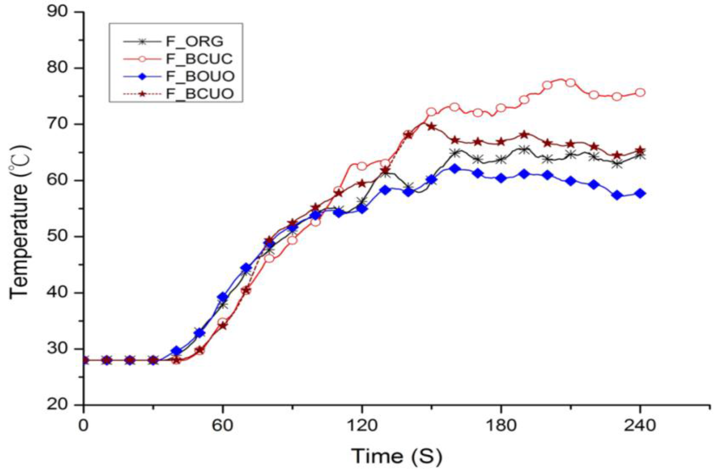 - In the second mode, a 0.8 m (H) × 11.2 m (W) smoke exhaust port is opened above the back wall. The indoor smoke is exhausted through the rear metal shaft when the fire occurs. The area is 9.12 m2, accounting for about 2.5% of the total floor area. The bottom of the opening is within 80 cm of the top of the wall. The air inlet is designed with reference to Taiwan’s fire prevention code. According to specifications, if natural smoke extraction is used, the smoke exhaust port area should be at least 2% of the total floor area.