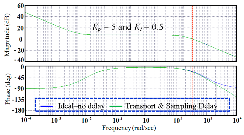 The total transport and sampling delay for the implemented current-regulating algorithm for the inverter is about 0.75 of the carrier period. The control loop delays can be modeled using Z-transform theory [21,22] with a zero-order-hold (ZOH) element to model sampling delay and a 1/Z block in series with the controller to model transport delay. Figure 5 shows a Bode plot of the Open Loop Forward Path Gain of the implemented current control algorithm, with the effects of transport and sampling delays included.