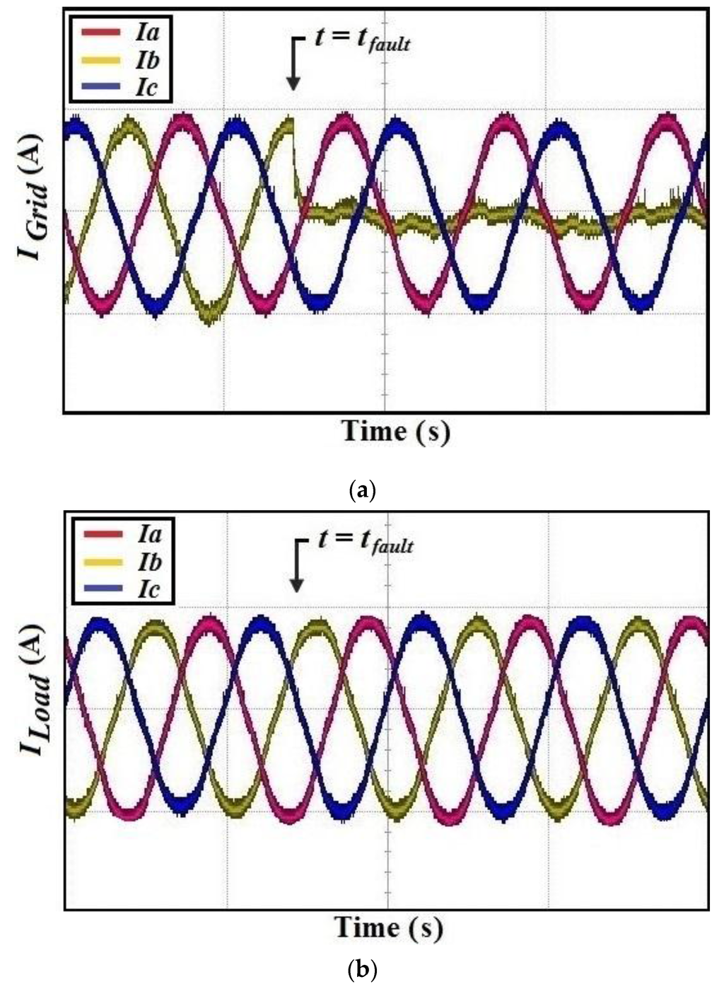 During normal operation, the load is supplied current from the grid and the DC link capacitor is charged through the rectifier. At a particular moment, say t = tfault, an asymmetrical fault is assumed to occur at the utility side and the isolating thyristor bank becomes activated to isolate the faulty phase from the load. Meanwhile, the inverter instantly supplies the faulty phase current to the load to keep the load current (ILoad) constant. Figure 6a shows the experimental results for the grid/power supply currents (IGrid) after the isolation of faulty phase, when the grid suffers a S-L-G fault. Figure 6b shows the constant and balanced load current obtained during such a condition using the proposed fault correction technique. Experimental waveforms for the grid (IGrid) and load currents (ILoad) during D-L-G and S-L-L faults are shown in Figure 7a,b. However, the inverter response during S-L-G, and D-L-G and S-L-L faults is shown in Figure 8a,b.