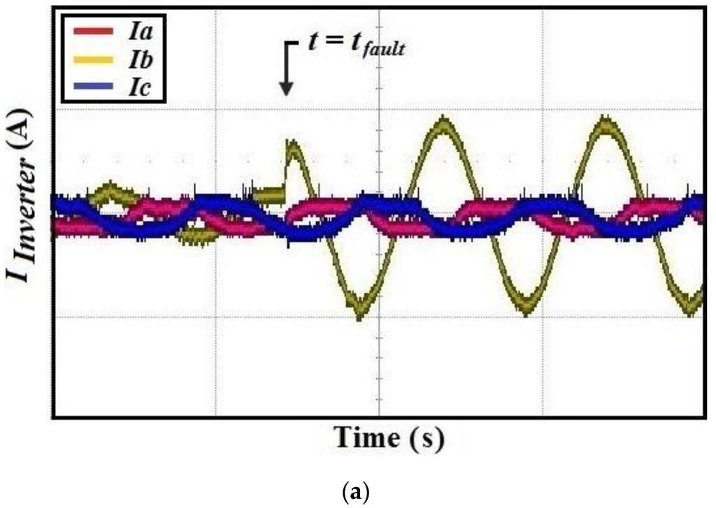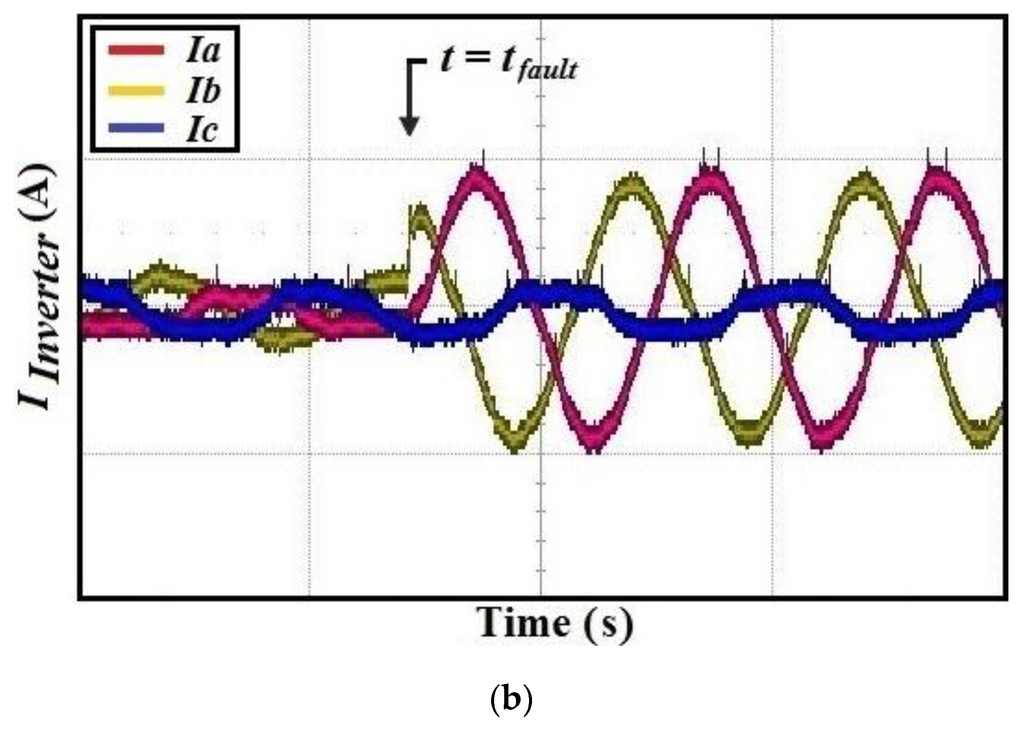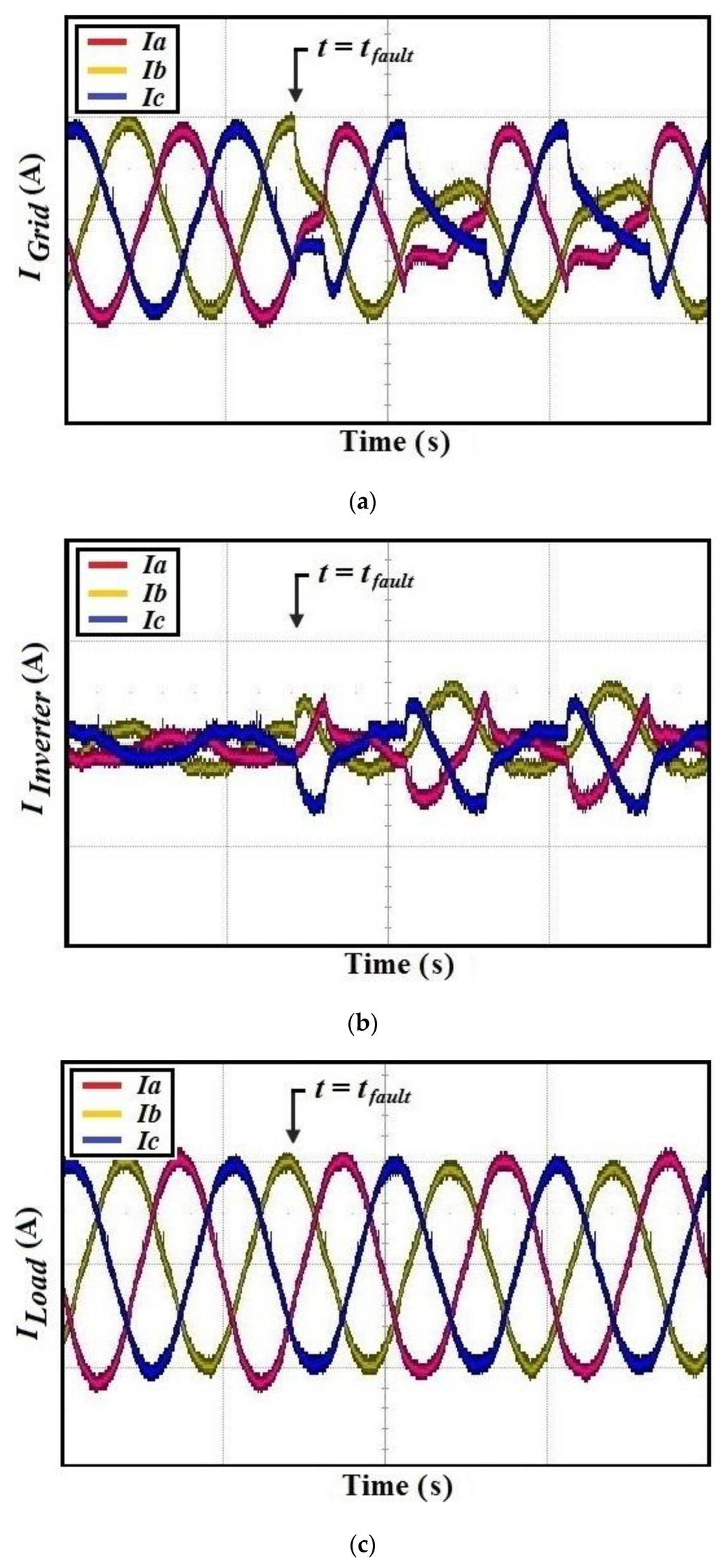 Experimental waveforms of inverter currents (IInverter) with the proposed asymmetrical fault correction technique during: (a) S-L-G; (b) S-L-L; and D-L-G faults (X-axis: 20 ms/div; Y-axis: 1 A/div).