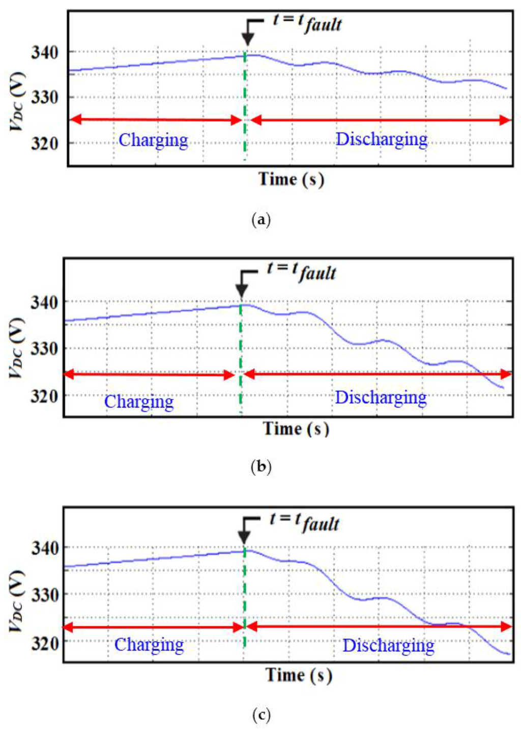 From the given experimental results, it can be seen that the load currents with the proposed fault correction technique are balanced and constant if the power supply goes through any of the above-mentioned asymmetrical faults. These experimental results are obtained when the sensitive load is operating near the fault location i.e., worst fault condition. Since the majority of loads operate far from the fault location and experience voltage sags of different magnitude, experimental results have been obtained during a sag for 8 ms in order to investigate the operation and performance of the proposed fault correction technique. Figure 9a shows the experimental waveforms of the grid current (IGrid) showing that when t = tfault, the grid undergoes a fault and starts supplying a sag for 8 ms after every half cycle. During such a condition, the inverter instantly supplies the supplementary current for the same interval to the load to keep the load current constant. This results in a seamless compensation of load currents. Figure 9b,c show the inverter and load currents. While operating with the proposed faults correction technique, the DC link voltage of the power converter also undergoes disturbances, caused by the asymmetrical faults at the grid side. However, this effect is effectively eliminated by tight regulation of the inverter current. Figure 10a–c show the change in the DC link voltage during such faults. Since the holdup time of the proposed system against the instabilities is utterly dependent on the size of the critical load and the energy storage capability of the system, important consideration should be given to the DC link capacitance of the system before installing the proposed system along with a sensitive load of specific rating [25]. The compensation energy, power, and the DC link capacitance can be expressed as follows: