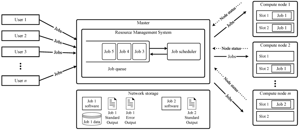 HPC clusters typically combine a master node and several compute nodes. The master node is the only one accessible by the users and is tasked with the cluster management using various software components, including the Resource Management System (RMS) and monitoring tools (such as Ganglia, Nagios, Zabbix), among others. The RMS is a software layer which abstracts users from the cluster underlying hardware by providing a mechanism where they can submit resource requests to run any supplied software program (hereafter denoted as jobs). It is worth noting that cluster resources are represented logically by a number of slots which, depending on the RMS configuration, can depict form a single CPU core to a whole compute node. The RMS working cycle consists of (1) gathering job submissions in an internal queue; (2) running a job scheduling algorithm to find the best possible matching between the resources available in the compute nodes and the slots requested by each job and (3) assigning slots and dispatching the job to the compute nodes (see Figure 1). Data and results are passed between the master and the compute nodes through a shared network storage space by means of a network file system or a storage area network.