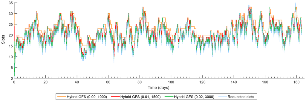 To assess the flexibility of the Hybrid GFS to suit the desired behaviour of the cluster administrator under different scenarios, a wide range of preferences must be tested. Given that these preferences are inherently subjective, a set of five different synthetic preferences were used in the experiments allowing us to measure to what extent the HGFS complies with them in each scenario as well to compare results across different scenarios. These synthetic preferences, denoted as “Hybrid GFS (, )”, determine that the HGFS configuration chosen in each case is the one with the maximum energy savings that has a service quality below and a number of node reconfigurations not higher than over the timespan of the validation and test sets. It must be noted that values used for these parameters in the experiment differ slightly from one scenario to another in order to adapt to the different average loads and arrival rates in each scenario.