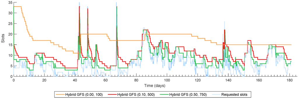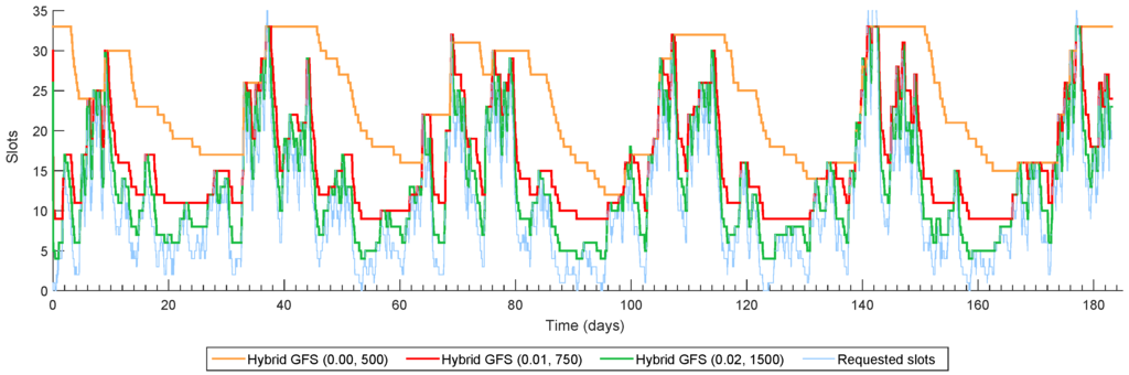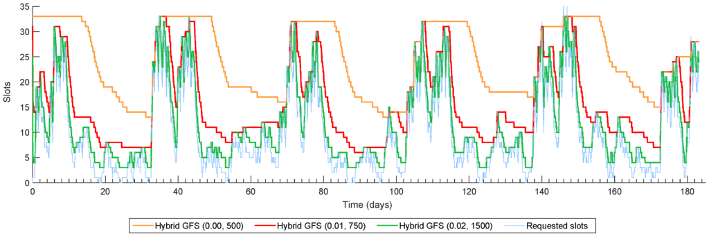 To measure the effect of applying each HGFS configuration, a cluster simulator has been developed for both training and testing, so that every model can be evaluated in the three criteria of the fitness function. The holdout method was used for validation, with a 50/25/25% split in training, validation, and test, respectively. Results obtained from the experiment using the test set of each workload are shown in the following tables. They are measured in terms of impact in the service quality and reduction in the cluster carbon footprint achieved according to the emission factors for the current energy mix, and the number node reconfigurations. Observe that the “Energy saved” column depends on this energy mix that has been estimated according to the 370 kg CO/MWh emission factor reported by the Ministry of Agriculture, Food and Environment from the Government of Spain (“Ministerio de Agricultura, Alimentación y Medio Ambiente”) [43], but some of the greenhouse gas is not emitted at Spain; the primary energy consumption is assumed to be served by Spanish sources but secondary sources are located at the country where the compute nodes are manufactured. In this respect, Megawatt-hours of saved energy are understood as the amount of energy that would be saved according to the Spanish mix of generation; the actual amount of globally saved energy is possibly higher. Also, charts have been generated to depict the evolution over time of the active cluster resources and the requested slots by the queued and running jobs. In particular, results for scenario 1 are displayed in Table 2 and in Figure 4, scenario 2 in Table 3 and in Figure 5, scenario 3 in Table 4 and in Figure 6, and scenario 4 in Table 5 and in Figure 7. Lastly, results obtained for the CMS cluster recorded workloads are displayed in Table 6 and in Figure 8.