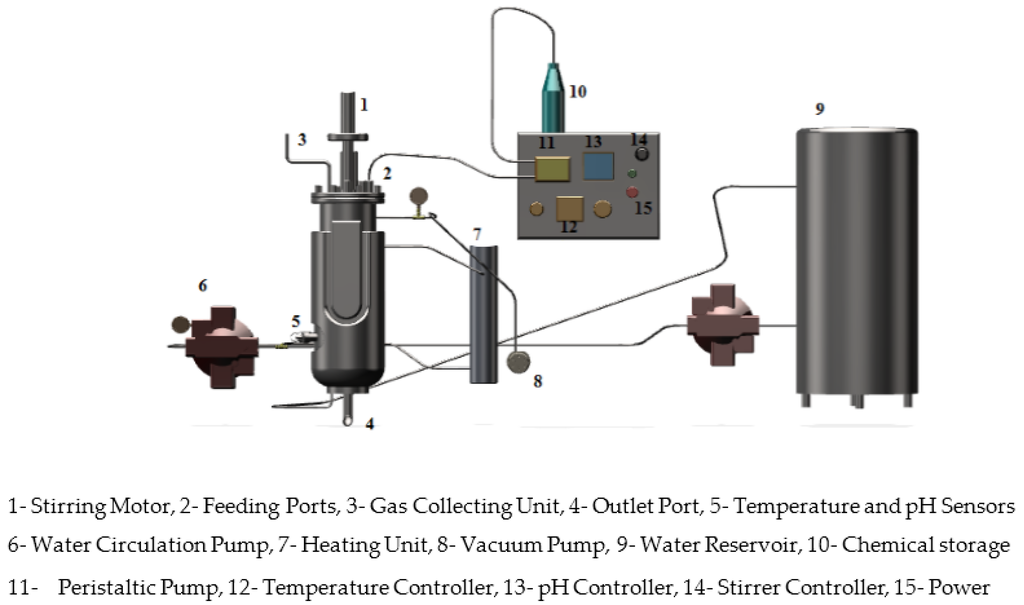 In the present study, a 20-L stainless steel double jacket anaerobic bioreactor was developed in collaboration with Zhejiang Instruments Limited (Figure 1). The reactor was equipped with a proportional integral derivative (PID) controller (CAN-C700, Aivpen Instruments, Le Qing, China) to manage temperature with the help of a heating unit and a platinum resistance temperature sensor (PT-100). The flow through heating unit was controlled by a solenoid valve (D01-4104, YuYao Sanlixin Solenoid valve Co.: Shanghai, China) and water circulation pump (UP Basic, Grundfos: Sozhou, China) connected to a 100-L water reservoir. The pH was managed by another PID pH controller (PH900, Acitek Instrumentsm: Shanghai, China), pH sensor (Easyferm plus 120, Hamilton Bonaduz AG: Bonaduz, Switzerland) and a peristaltic pump to add the desired amount of chemical from a 500-mL glass bottle to maintain pH at specific points. Thorough mixing was done by a three-stage stirrer connected to a permanent magnet DC servo motor (ZSD05A, Shanghai ShuDong Motor Co., Ltd.: Shanghai, China). There was an inlet port (1-inch diameter) for feeding materials at the top, and an outlet port (1-inch diameter) along with a ball valve was at the bottom. A vacuum pump (FY-1H-N, Zhejiang E & M Value Co.: Zhejiang, China) was also attached to the reactor to develop anaerobic conditions [24,25].