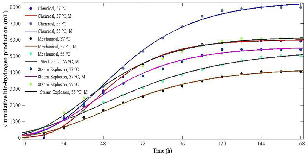 By placing the kinetic parameters in Equation (1), the resultant tmax values are shown in Table 1. The increase in temperature decreased the tmax for mechanical pretreatment and steam explosion and increased it for chemical pretreatment. The tmax can be used as the hydraulic retention time (HRT) in continuous production of bio-hydrogen. As the tmax for steam explosion at 55 °C is the smallest in all treatments, steam explosion is more suitable for continuous production processes.
