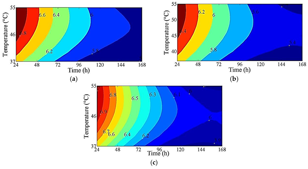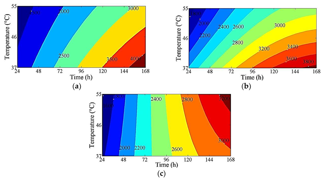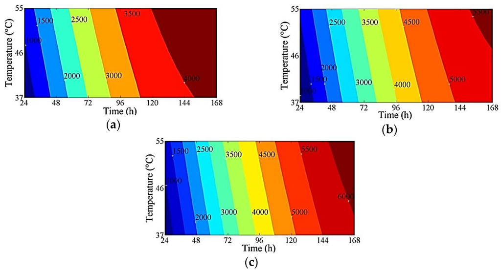 Here, is the modeled cumulative bio-hydrogen production. The quadratic model developed has a high F value and can significantly explain 91.2% of the variability. The 2D contour plots developed for modeled bio-hydrogen production are shown in Figure 3. It was revealed from modeling that the impact of temperature during the first 24 h was the highest under chemical pretreatment and the lowest under steam explosion. This can be visualized in the contours by observing the variation in the size of the triangle filled with dark blue color (Figure 3). The decrease in bio-hydrogen production was observed first under mechanical pretreatment after 60 h of incubation, which became more prominent under mesophilic temperature after 108 h. Such a change in bio-hydrogen production can be visualized by the area of the color distribution in surface plots or by observing the change in the width of contours. The decrease in modeled bio-hydrogen was observed after 72 h and 84 h, which also became more protuberant after 120 h and 144 h of incubation at 37 °C under steam explosion and chemical pretreatment, respectively. The decrease in actual bio-hydrogen production was also observed during the same span of time, but it was difficult to observe the noticeable change in bio-hydrogen production, as observed in contour and surface plots. As a whole, the 2D illustration of the modeled bio-hydrogen production provides a better representation, which is more helpful to understand the impact of pretreatment and temperature as compared to the line graphs developed.