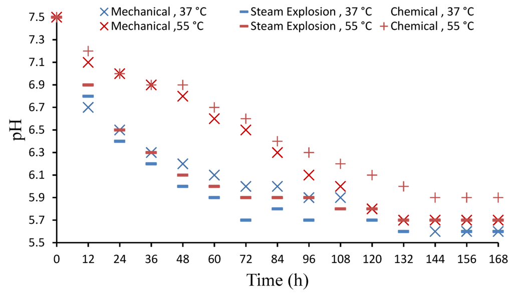 There was a sudden drop in pH during the first 12 h of incubation, especially under mesophilic reactors [44]. The increase in temperature from 37 °C to 55 °C decreased the initial drop in pH, which also increased the bio-hydrogen production during 12 h of incubation (Figure 2 and Figure 4) [45]. The mesophilic reactor under mechanical pretreatment has a higher drop in pH during the first 12 h of incubation, but in next 12 h, the drop in pH was less compared to other mesophilic reactors. On the other hand, the drop in pH under steam explosion pretreatment was least effected by an increase in temperature from 37 °C to 55 °C till 60 h of incubation, after which, mesophilic pH was fluctuating between 5.7 and 5.8 till 120 h, and thermophilic pH decreased to 5.7 till 144 h of incubation; whereas, reactors under chemical pretreatment have the least pH drop during 12 h of incubation and the impact of an increase in temperature within the experimental range was higher than steam explosion treatment, but less than mechanical. The difference between pH under both temperatures kept on increasing till 72 h of incubation, after which, the mesophilic pH was stable at 5.9 till bio-hydrogen production was ceased at 120 h, and the thermophilic drop in pH continued till bio-hydrogen production was ceased at 144 h of incubation. Although the pH at which the bio-hydrogen production ceased for chemical pretreatment was the same under both temperatures (pH 5.9), the incubation time at which the bio-hydrogen production was ceased was different. On the other hand, the final pH at the end of incubation was also different, as the pH again started to decrease after bio-hydrogen production was ceased in the mesophilic reactor. The thermophilic pH at which the bio-hydrogen production ceased in other treatments was higher than the mesophilic pH. As a whole, pH from 6.7 ± 0.1 to 5.8 ± 0.1 and 7.1 ± 0.1 to 5.8 ± 0.1 was found suitable for co-digestion under mesophilic and thermophilic conditions, respectively.