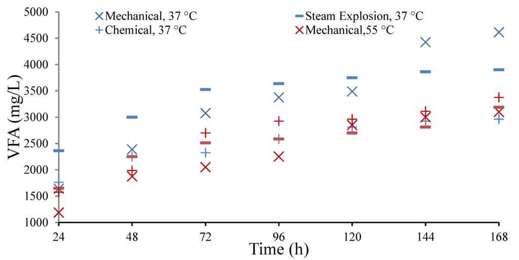 In the present study, heat shocked sludge was used for co-digestion with pretreated straw, and it was observed that the VFA contents increased with an increase in time (168 h), which was in agreement with the finding of Kim [46]. The effect of pretreatment, temperature and time on VFA is represented in Figure 6. The highest experimental VFA at the end of incubation was observed in the mesophilic reactor under mechanical pretreatment. The increase in temperature decreased the VFA content for mechanical and steam explosion treatments, as also observed by Gadow [45]. The VFA contents were initially higher in the mesophilic rector under chemical pretreatment, but during 48 h–72 h of incubation, thermophilic VFA contents became higher. This was the same duration in which the bio-hydrogen production was increased dramatically in thermophilic reactors as compared to the mesophilic reactor under chemical pretreatment (Figure 2). As a whole, the VFA production rate was higher till 72 h, which was the same duration in which bio-hydrogen production was also higher, after which, VFA and the bio-hydrogen production rate both started to decrease. However, there was a sudden increase in VFA contents in the mesophilic reactor under mechanical pretreatment during 120 h–144 h of incubation. For the same duration, the VFA production was not so high in the thermophilic reactor under the same treatment, but bio-hydrogen production was much higher in the thermophilic reactor. The higher VFA contents can be inhibitory to the growth of bacteria, as they cause unfavorable physical changes in the cell and excessive energy is required to pump ions [25]. Such high energy is available at elevated temperatures, which increased the yield at elevated temperatures, as observed in the present study [47,48,49].