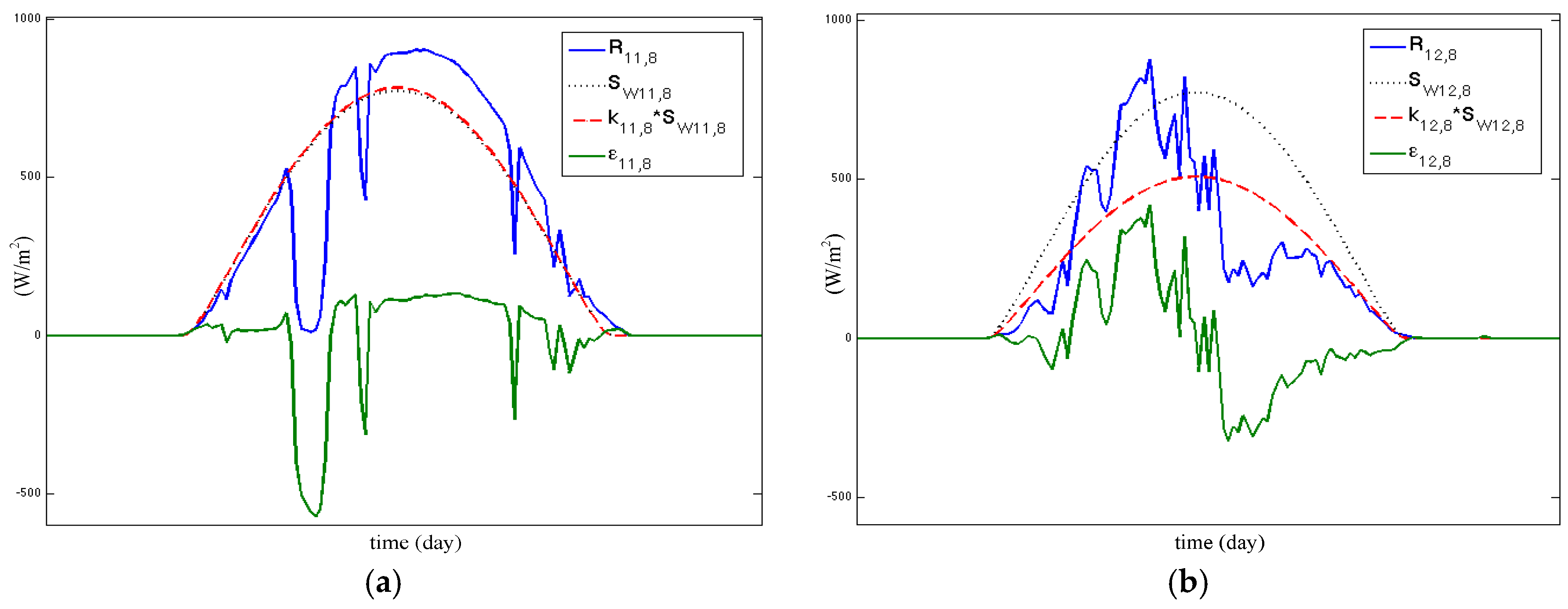 - , instantaneous variability for the nth time interval of the jth day of the mth month, is an additive “noise” component accounting for variations of the solar irradiance during a day;