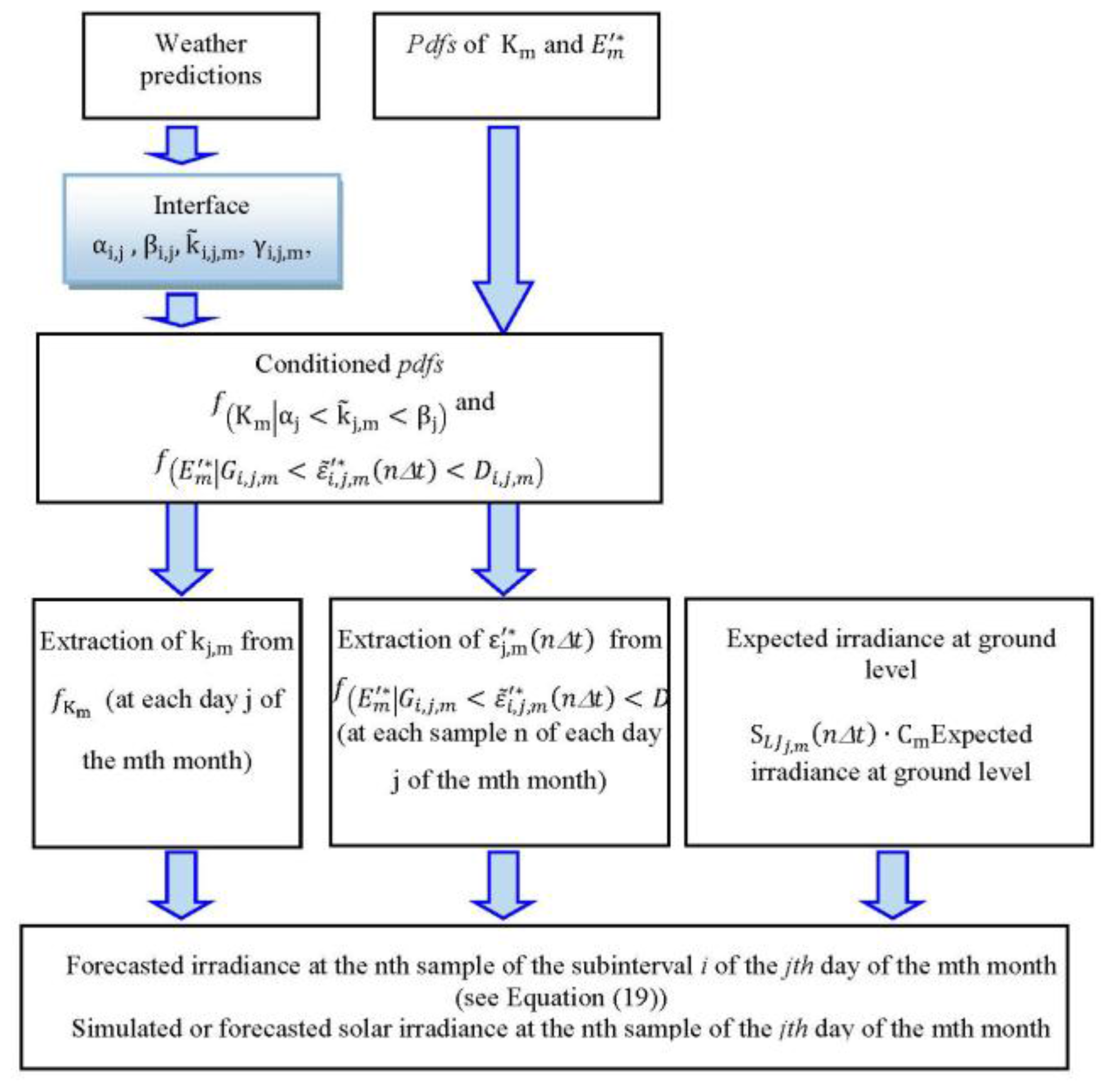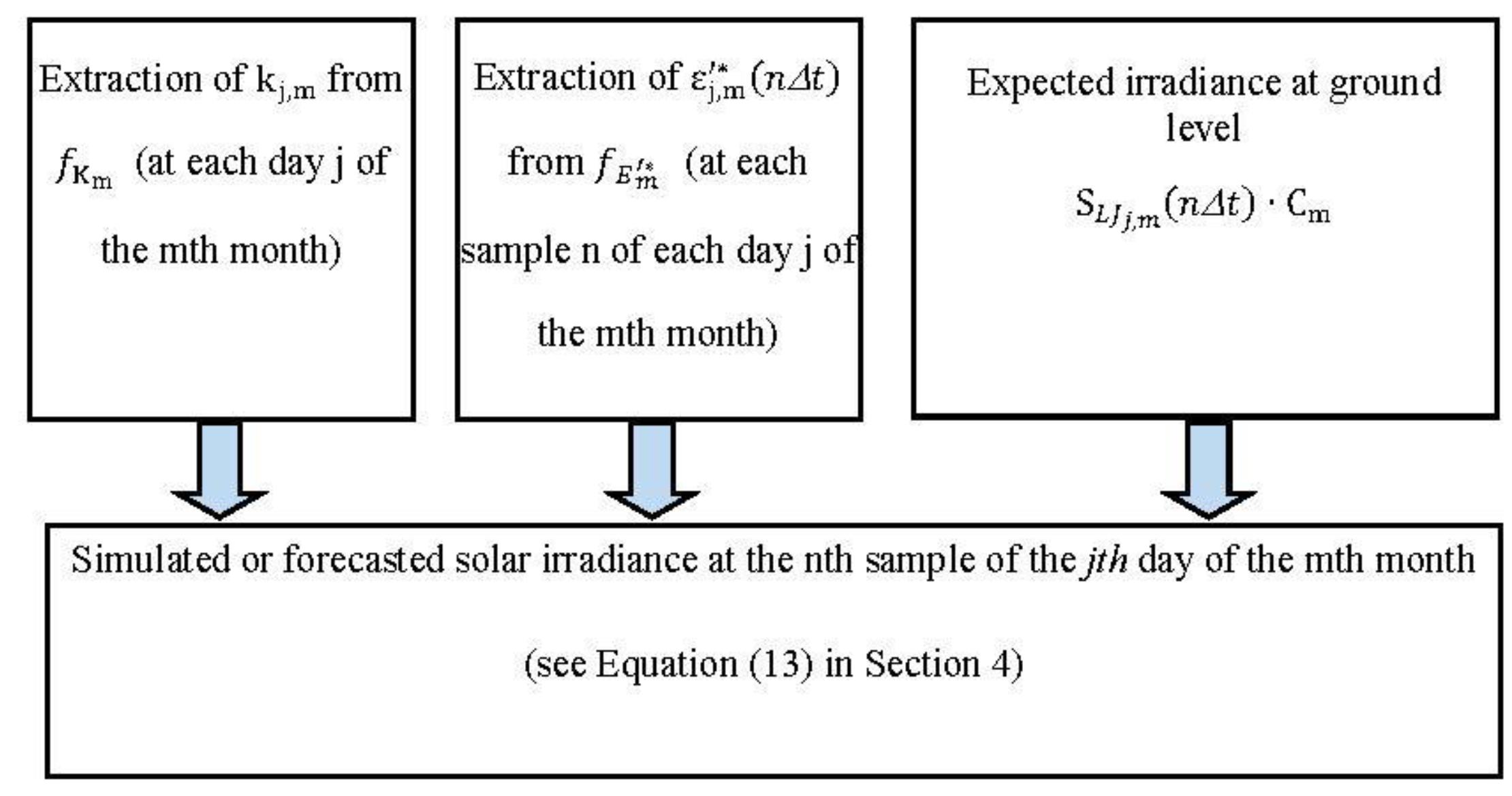 - Extraction of the ki,j,m values for each of the Ni subintervals of the jth day according to the day-ahead weather prediction from conditioned distributions analogously to Equation (15);