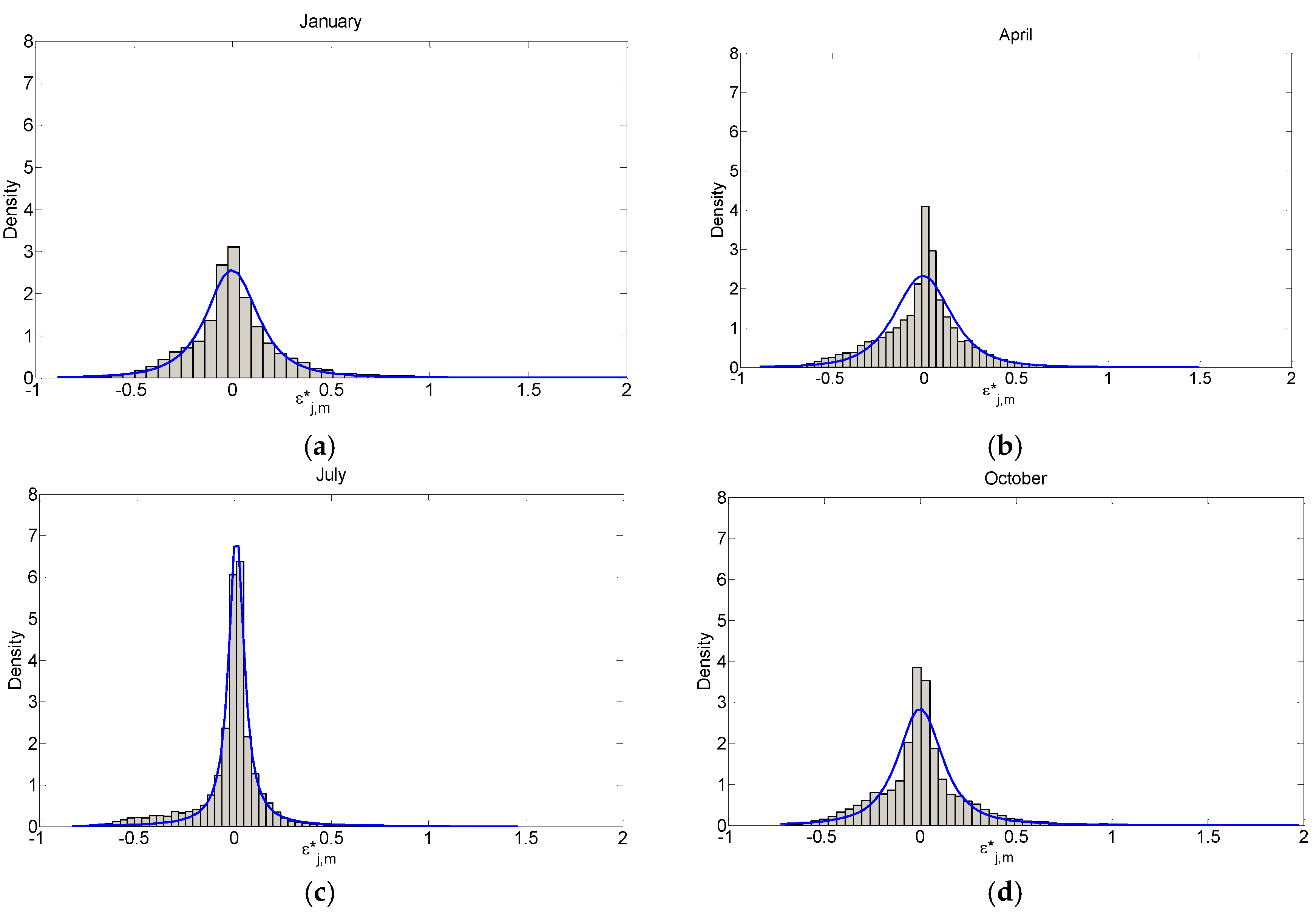 | Month | 1st Distribution | p′1 | p′2 | Weight (w1) | 2st Distribution | p″1 | p″2 | Weight (w2) | Norm. RMSE Mean (%) |