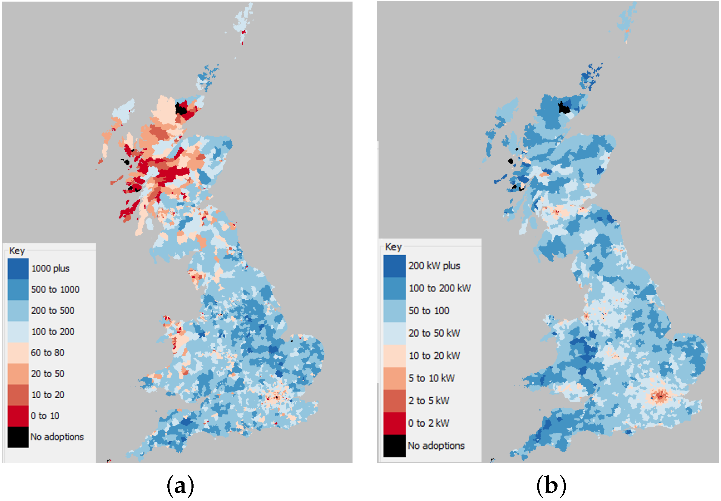 Figure 2b) illustrates a lack of adoption in urban centres, particularly around large cities, such as London, Birmingham, Manchester and Liverpool. This might be expected, as rooftop areas for installation are at a premium, in combination with a high population density, leading to high instances of multiple households within one physical building. The distribution also highlights the high number of installations in the southwest of England, and the capacity density plot (