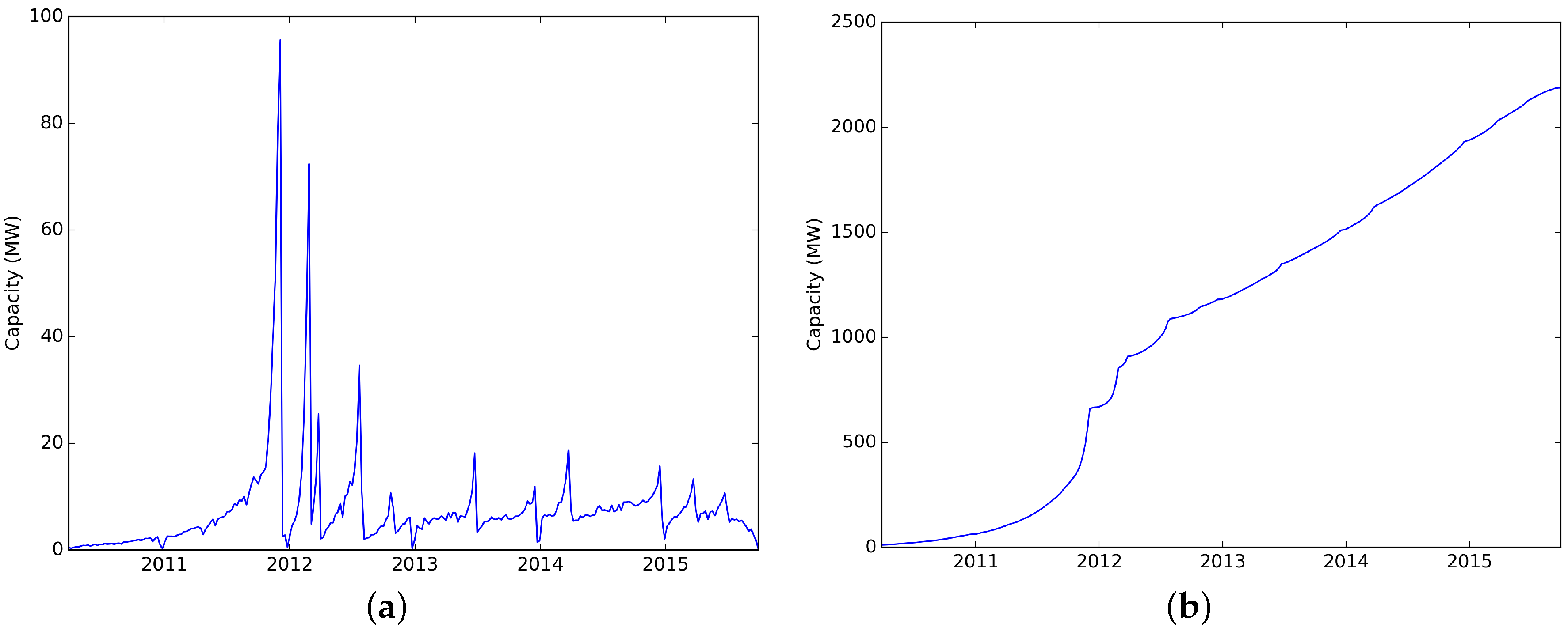 24]. This highlights the fact that, despite the strong economic rationale behind trying to install a system before detrimental changes were made to the tariff rates, the spikes cannot easily be modelled using classical rational economics techniques, as on the face of it, nothing has changed in the rational evaluation of the case for installing PV prior to December 2012. This also highlights the influence of the mass media on adoption rates, as the prospective changes to tariff rates were highlighted by the mass media (e.g., [
