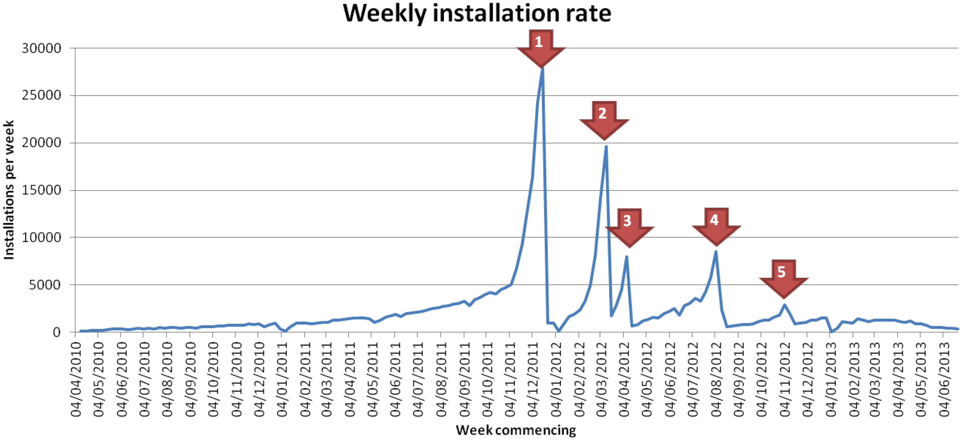 An analysis of the dates of the spikes in adoption reveal that the first (and largest) spike in the rate adoption started in the week commencing 6 November 2011 and reached its peak in the week commencing 11 December 2011 before collapsing in the week commencing 18 December 2011. This was followed by a similar pattern (albeit smaller scale) repeated four times (