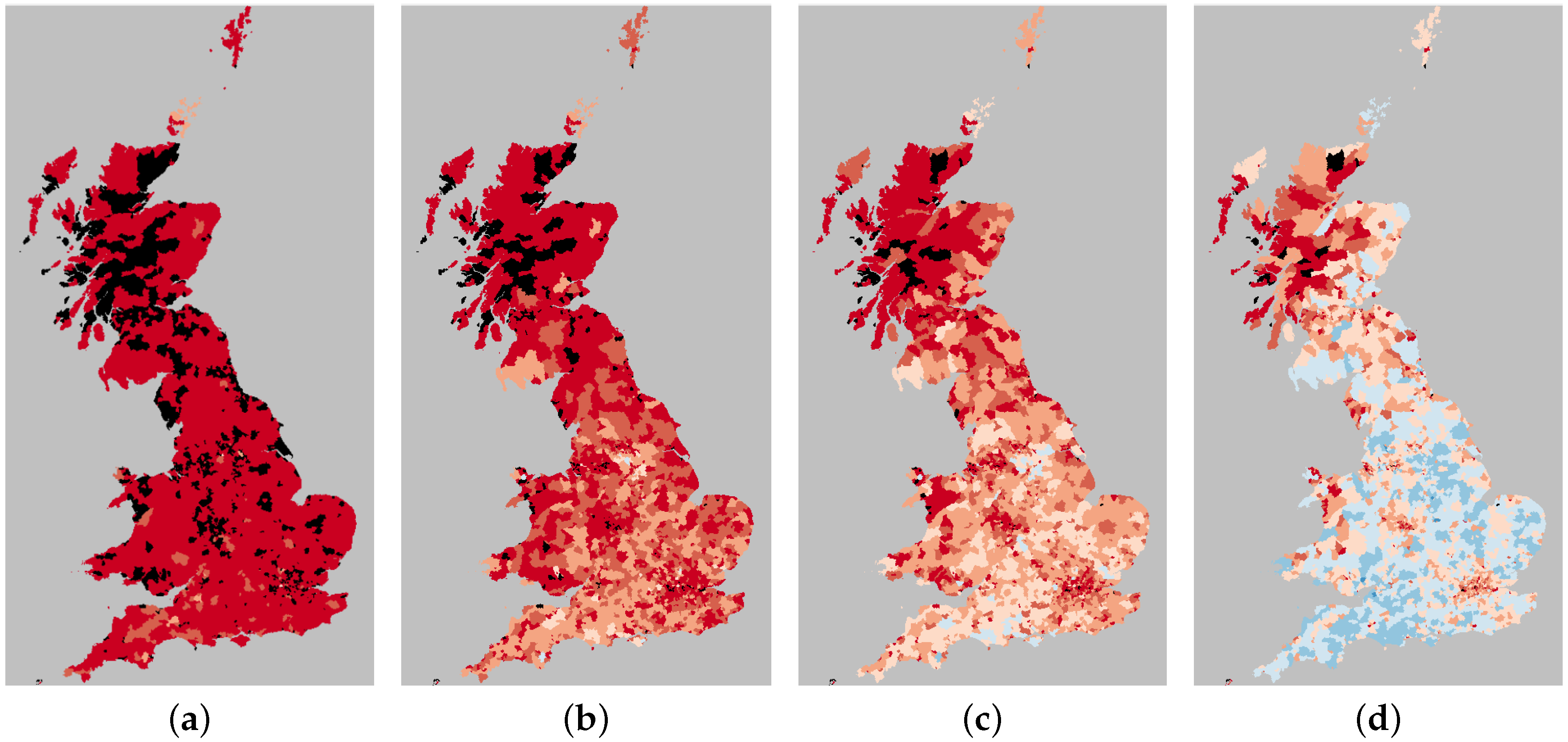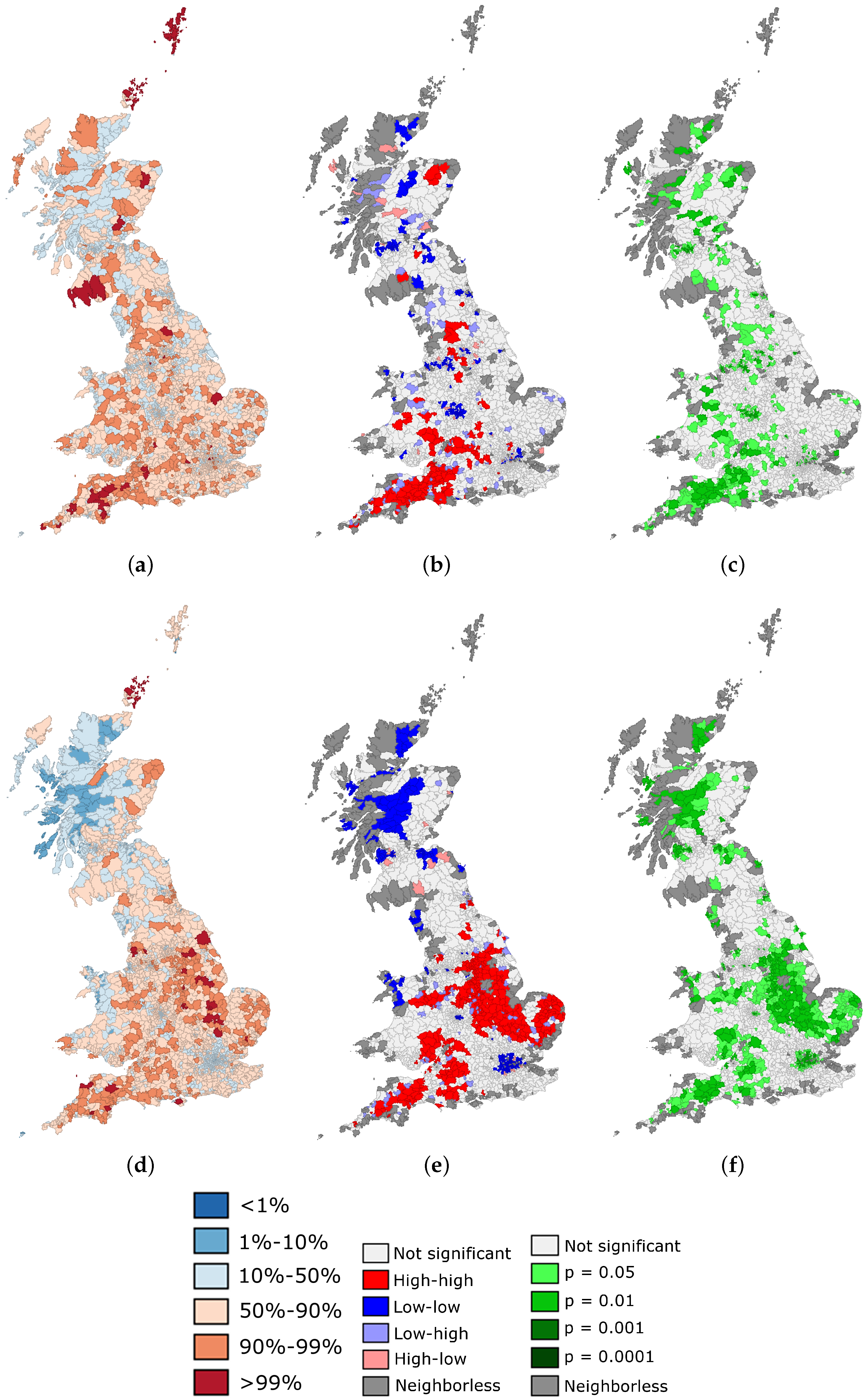 Figure 7c,f). These confirm that the areas of high-high clustering in the southwest and east of England and the area of low-low clustering around London, Birmingham, Manchester and Liverpool have high significance.