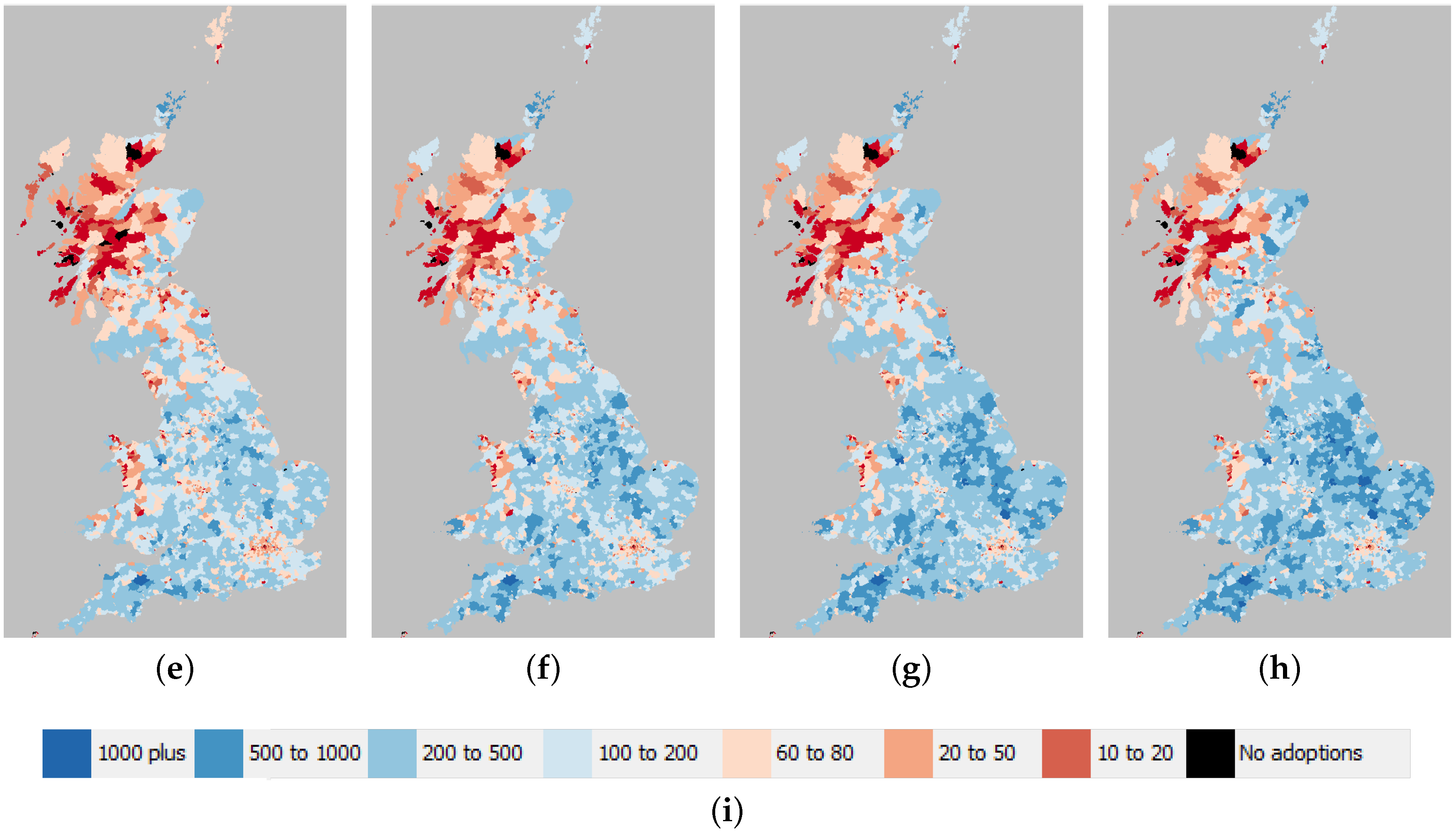 Figure 7d). These plots give a normalised view of the distribution of PV across the UK, showing that the southwest of England remains an area of high installed capacity and indicating that a further area of high installed capacity has emerged in the east of England. LISAs were produced to illustrate and describe statistically the geographical position and strength of the clusters over time. Firstly, these show the locations of clusters and the type of cluster (