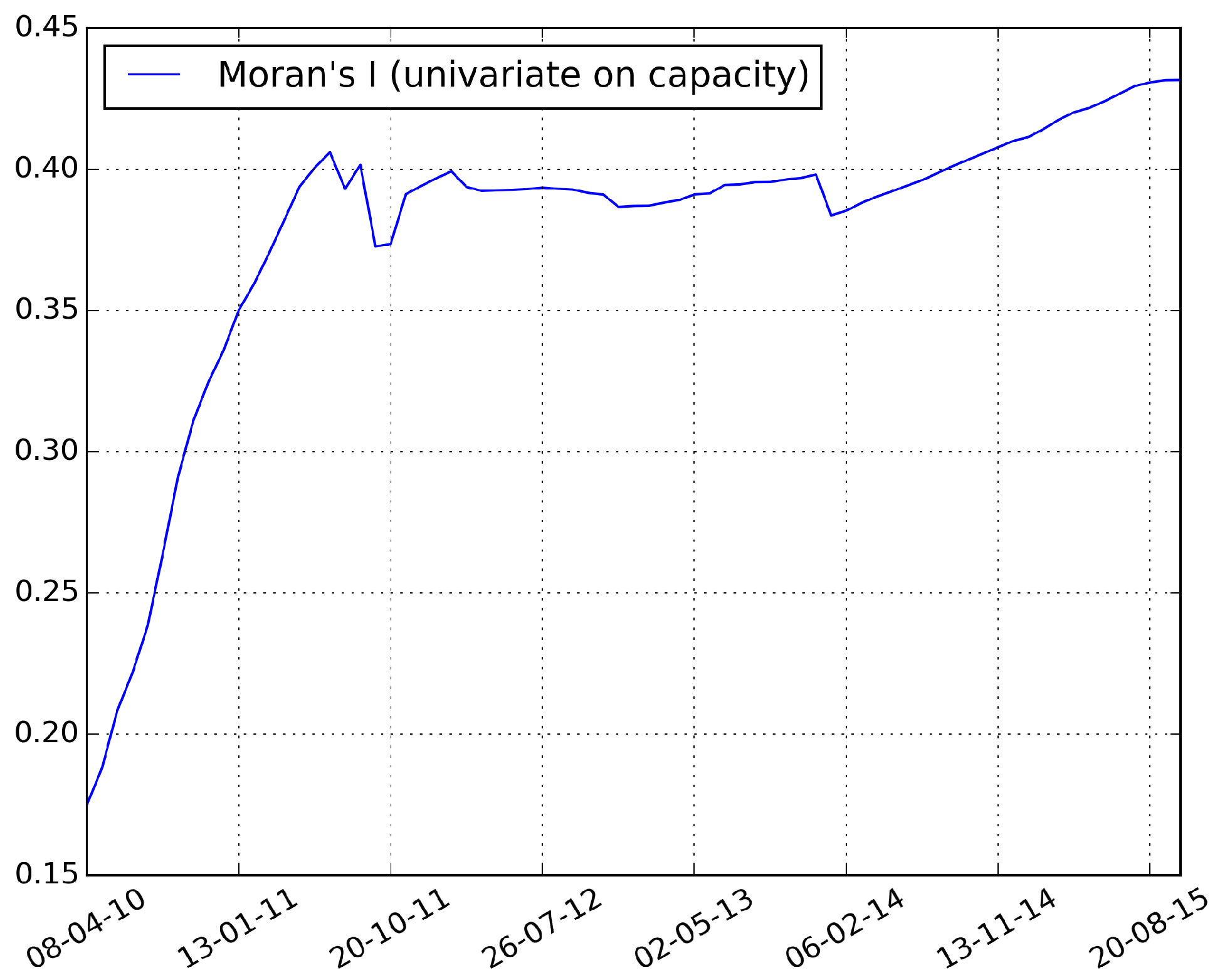 The snapshots of the spatial visualisations provide visual information about how domestic PV capacity is distributed around the UK and how that has evolved, in a format that can be intuitively interpreted. It is clear that in general terms, embedded distributed generation in a domestic setting is located away from centres of high electricity consumption (the major conurbations). To formalise the analysis of this observation requires statistical methods to examine the degree to which clustering exists and how that clustering is distributed across the country and to analyse the evolution of these over the snapshots in time presented above. Such an analysis allows for hypothesis testing against the null hypothesis that no clustering exists and testing for a change in the nature of the spatial distribution over time. Moran’s