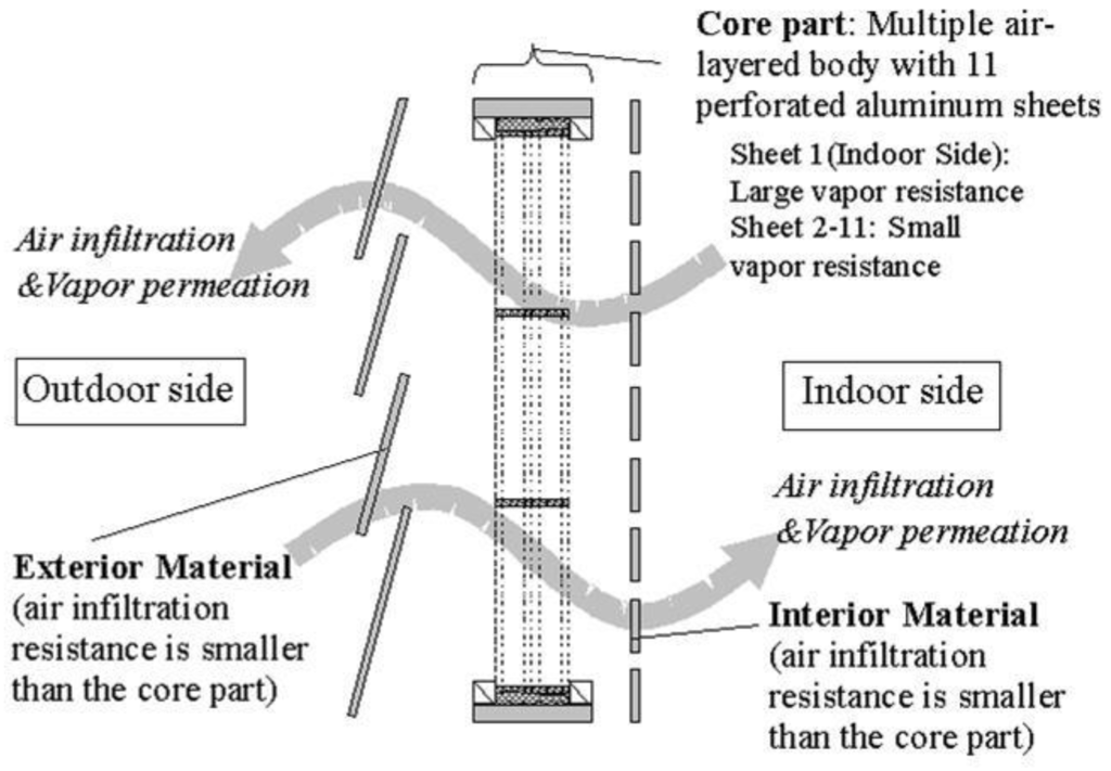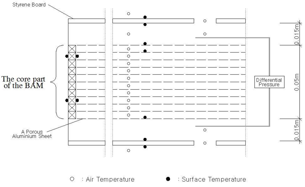 A BAM includes internal and external materials with ventilation resistances lower than that of the core part, which consists of a multi-layered air body made from porous aluminium sheets, as shown in Figure 1. The member allows air to flow between the indoor and outdoor sides through its entire surface under the effect of the differing indoor and outdoor temperatures or external wind pressure. This ensures that the required ventilation performance is maintained. In addition, the vapour that flows through the BAM is rapidly discharged by air movement, thereby avoiding damage resulting from internal condensation. Although some studies have been conducted on ventilation through building skins, such as those of Dimoudi et al. [2], Imbabi et al. [3], and Stavridou et al. [4], Biserni et al. [5], the present study was unique in that the employed BAM did not require the driving force of a mechanical fan, but only natural wind pressure and temperature difference. Based on analysis of meteorological data, internal condensation during the period that the air flowed through the member was prevented by the use of porous aluminium sheets with different opening ratios. The efficiency of the heat exchange inside the member was also maximized by using multiple layers of the aluminium sheets.