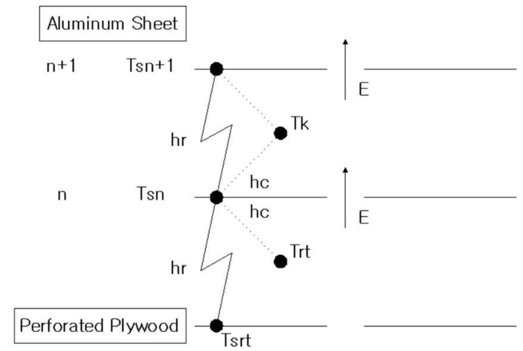 - The convective heat transfer rate from the surface of an aluminium sheet, hc [W/m2°C], is determined using the following equations of the Nusselt number Nu and by convective heat transfer (The Nusselt number was determined with reference to [9]. The convective heat transfers of fully developed laminar flows through pipes with different cross sections are defined in this work, and Nu = 7.54 was adopted as the appropriate value for the present study).