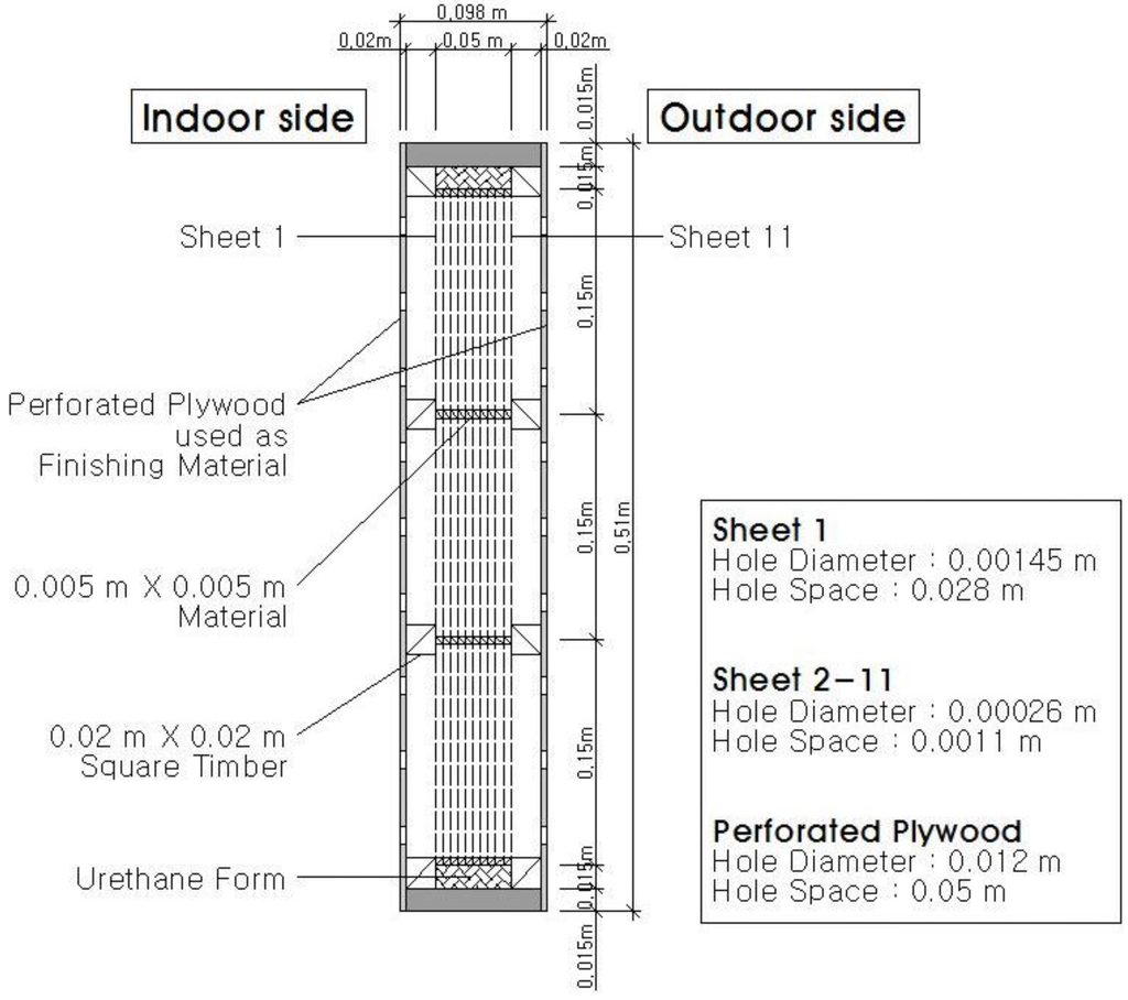 With regard to the specifications of the porous polyethylene plywood used as the finishing material, the hole diameter was set to 0.012 m, the hole spacing to 0.05 m, and the opening rate to 4.5%. Generally, the finished structure of a BAM affects the air permeability of the member, and hence the thermal insulation and vapour permeation. In the samples employed in the present study, however, the finishing materials had an extremely low air permeance resistance compared to the core part, and therefore did not affect the overall air permeance and heat insulation performance of the members. Hence, in the following discussion of the air permeance and heat insulation performance of the members, sheets numbered 1 to 11 are considered to determine the air infiltration and thermal insulation performances of the BAM. The temperature of the air in the 0.02 m air layer formed on the indoor side is also regarded as the actual temperature of the air flowing inwards.