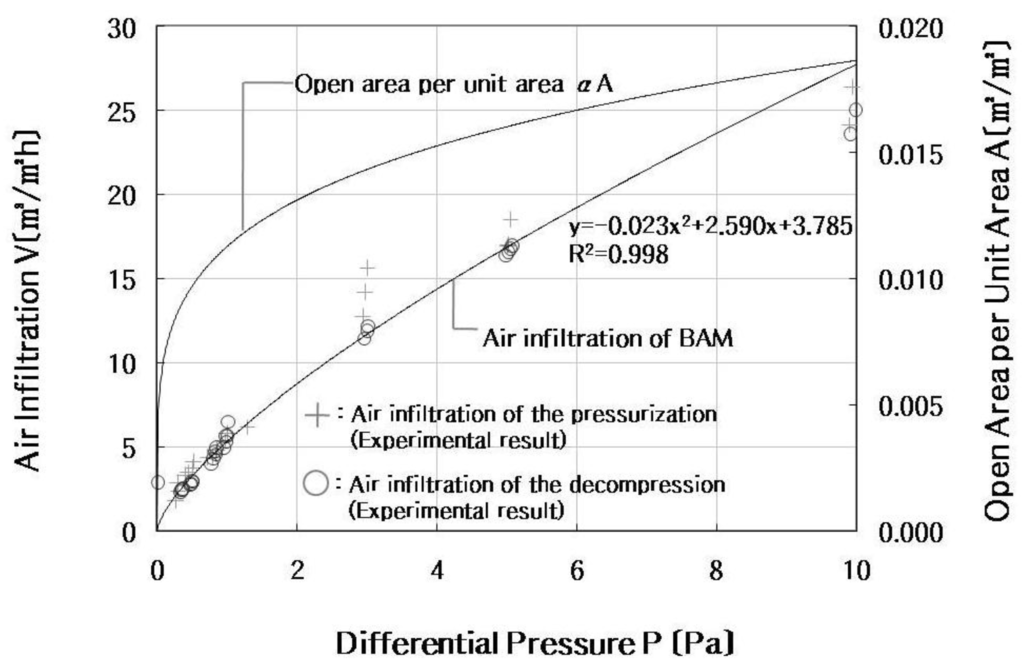 When predicting the volume of air infiltration, it was assumed that the buoyancy due to the temperature difference across the air layer could be ignored, but not the pressure difference between the indoor and outdoor sides of the wall. The volume of air infiltration, V [m3/ (m2s)], through the wall is given by: