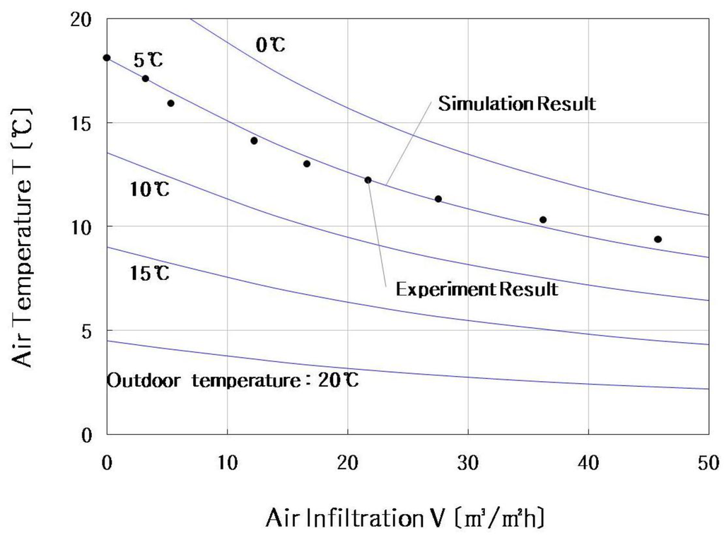 Figure 7 shows the temperature variation of the outside air flowing into the room under constant air permeation. For air permeations within 3–46 m3/ (m2h) under the conditions set for outside air (temperature = 5 °C, which is the design condition of the member), the temperature of outside air flowing into the room varied between 8.1 and 18.1 °C. Although the experimental values indicated in Figure 7 differ somewhat from those of a previous study (Yoon and Hoyano [7]) due to the casing of the core part of the BAM in the present study, they remain largely comparable. The differences between the modeled and experimentally measured temperatures are within 0.5 °C and dependent on the amount of air infiltration. This could be due to subtle changes in the pressure and temperature conditions of the chamber. However, the differences between the measured and calculated values in the present study are within 5%, which thus validates the proposed numerical models for predicting heat and air transfer.